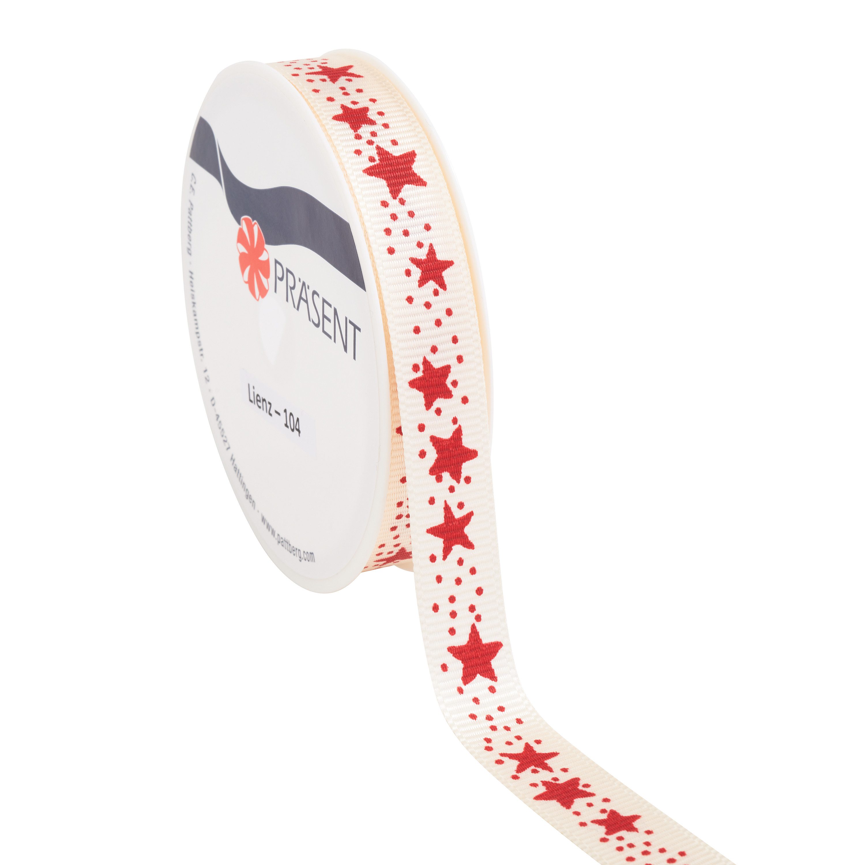 Mit dem Ripsband 'Lienz' verleihst du deinen Geschenken eine besondere Note. Das Schleifenband hat eine Breite von 15.0 mm und eine Длина von 3.0 m. Die Grundfarbe ist Crème und wird von roten Sternen geziert. Dank der Webkante ist das Band besonders stabil und lässt sich einfach verarbeiten. Das Material besteht aus 100 % Polyester (PES) und eignet sich perfekt für die Winterzeit. Verwende das Ripsband für individuelle Geschenkverpackungen oder als Dekoration für deine Weihnachtsdekoration. Mit dem Ripsband 'Lienz' setzt du besondere Akzente und sorgst für eine festliche Atmosphäre!