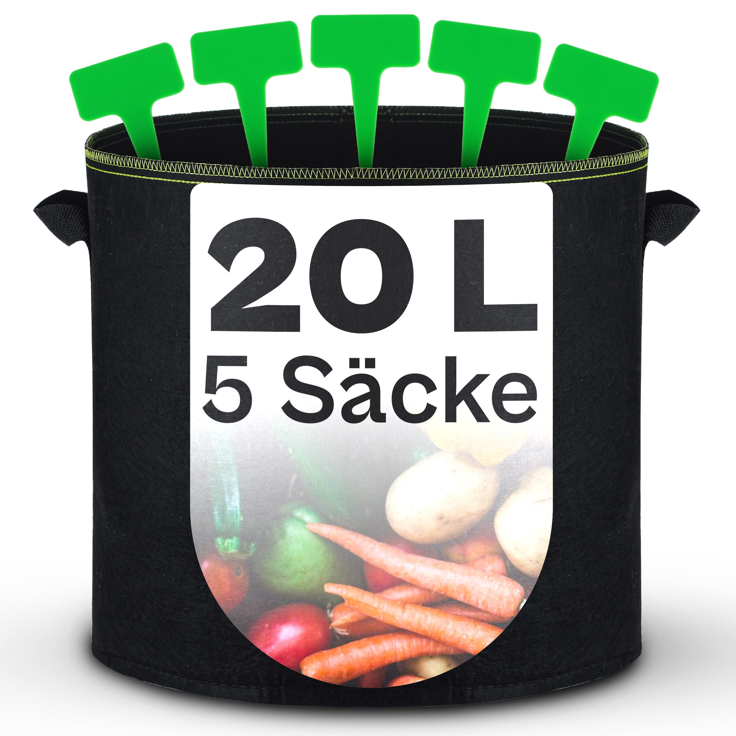 Volumen: 20 Liter | Durchmesser: 30 und Höhe: 26 cm | Material: Vlies Stoff | Farbe: Schwarz | Inklusive 5 Pflanzenstecker zum Beschriften der Pflanzen.