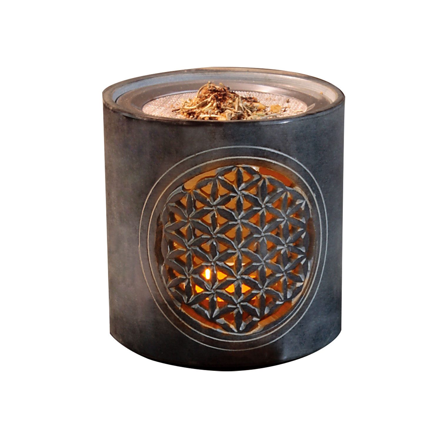 Kunstvoll geschnitztes Stövchen für feierliche und stilvolle Räucherrituale. Es eignet sich besonders gut für kräuterhaltiges Räucherwerk, da hier die Temperatur nicht so hoch wird und sich das ganze Bouquet mit allen Nuancen verbreiten kann. Jedes Stück ist ein Unikat. Lieferung inklusive Sieb Ø 9 cm. Speckstein, H. ca. 10 cm, Ø 10 cm.