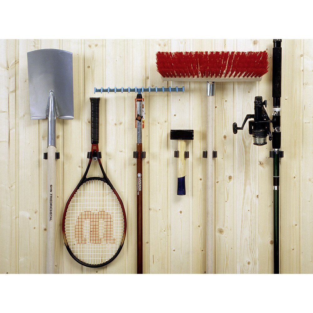 Der PRAX®-Gerätehalter hält Geräte bis zu 35 mm wie z. B. Besen · Handfeger · Schrubber · Kehrschaufeln · Rechen · Grubber · Spaten · Schneeschaufeln · Schaufeln · Straßenbesen · Sensen · Fächerbesen · Heckenscheren · Harken · Farbroller · Hämmer · Feilen · Schraubendreher · Stecheisen · Angelruten · Ski-Stöcke · Squash-Schläger · Tennis-Schläger · Gehhilfen (Gummiteile auch in Grau) · Gewehrläufe · Fluchtstäbe · Ausstellungssysteme · Befestigungssysteme · Federstahldicke 0,8 mm