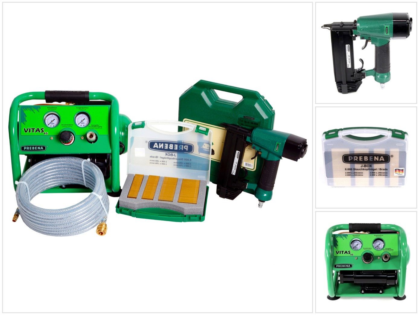 Der Druckluftnagler von Prebena Modell 2P-J50SDS wird in einem praktischen Transportkoffer geliefert. Er ist geeignet für Stauchkopfnägel des Types J von 16 - 50 mm. Mit einem Arbeitsdruck von 5 - 7 bar überzeugt der 2P-J50SDS in vielen Anwendungsbereichen wie z.B. Polstern, dekorieren, Sockelleisten, Deckenleisten, Bilderrahmen, Zierleisten, Glasleisten, Hohlkehlleisten und vielen mehr. Die Auslösesicherung und der Geräuschdämpfer sorgen für ein komfortables und sicheres Arbeiten. Der Kolbenkompressor Vitas 45 von Prebena ist ein leistungsfähiger und kompakter Kompressor. Das Gerät überzeugt durch seinen leistungsstarken 230 V Motor, 24 l/min Füllleistung und mit einer Ansaugleistung von 41/min. Впередhin verfügt der Kolbenkompressor über geschützte Amaturen und eine anwenderfreundliche Handhabung. Durch sein geringes Gewicht ist jederzeit ein einfacher Transport möglich. Der Kompressor verfrügt über ein Kesseldruckmanometer, ein Ausgangsdruckmanometer, sowie über einen Druckminderer am Druckluftausgang. Der Handgriff ist gummiert und verfügt einen Antirutschbelag. Die massiven Gummifüße des Geräts sorgen für einen sicheren Stand. Da das Gerät ölfrei betrieben wird, ist niemals ein Ölwechsel nötig.