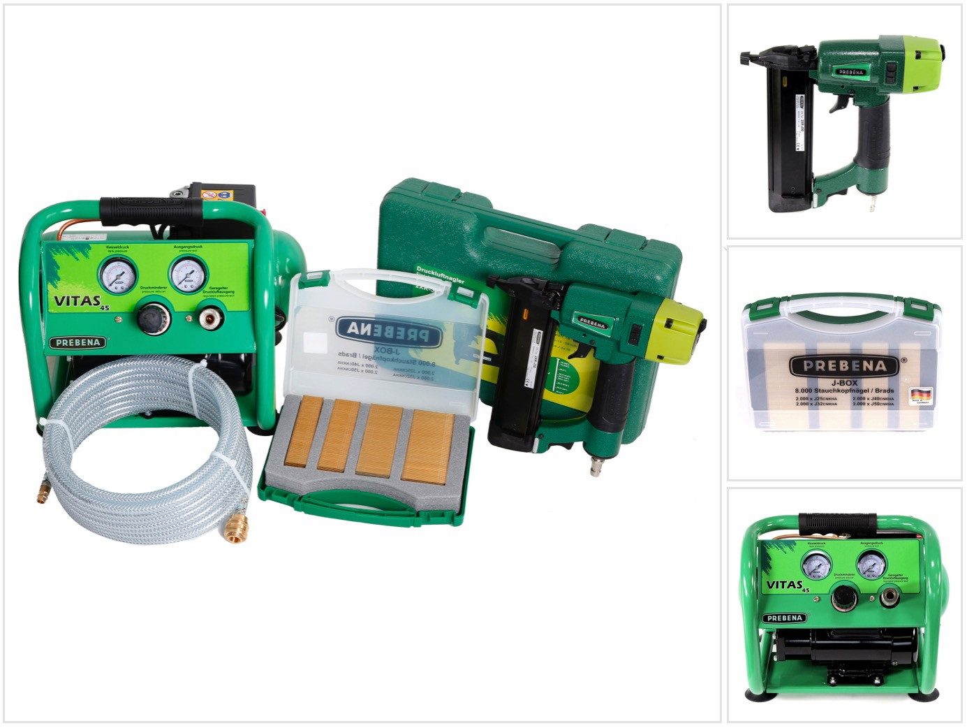 Der Druckluftnagler 2XR-J50 von Prebena überzeugt durch seine kompakte Abmessungen und sein geringes Gewicht. Durch das Metallgehäuse ist der Nagler extrem stabil und handlich. Der Nagler ist für Stauchkopfnägel ( Brads ) vom Type J 16 - 50 mm geeignet. Das Gerät verfügt über ein Seitenladermagazin, Tiefeneinstellung, eine Auslösesicherung und einen Geräuschdämpfer. Darüber hinaus können Sie die Abluft beliebig verstellen. Das Gerät eignet sich sehr gut für filigrane Arbeiten, wie z.B dem Anbringen von Teppichleisten und der Montage von Bilderrahmen. Der Kolbenkompressor Vitas 45 von Prebena ist ein leistungsfähiger und kompakter Kompressor. Das Gerät überzeugt durch seinen leistungsstarken 230 V Motor, 24 l/min Füllleistung und mit einer Ansaugleistung von 41/min. Впередhin verfügt der Kolbenkompressor über geschützte Amaturen und eine anwenderfreundliche Handhabung. Durch sein geringes Gewicht ist jederzeit ein einfacher Transport möglich. Der Kompressor verfrügt über ein Kesseldruckmanometer, ein Ausgangsdruckmanometer, sowie über einen Druckminderer am Druckluftausgang. Der Handgriff ist gummiert und verfügt einen Antirutschbelag. Die massiven Gummifüße des Geräts sorgen für einen sicheren Stand. Da das Gerät ölfrei betrieben wird, ist niemals ein Ölwechsel nötig.