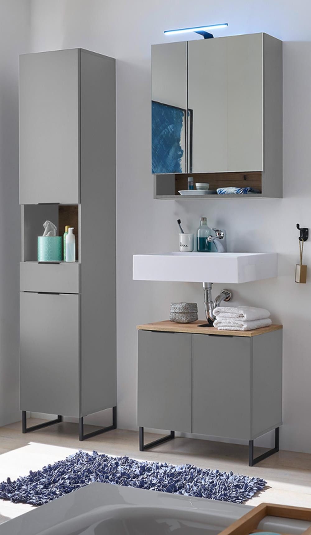 Set beinhaltet | Waschbeckenunterschrank B/H/T 60x60x35 cm, Spiegelschrank inkl. LED B/H/T 60x75x22 cm, Hochschrank B/H/T 38x195x32 cm |