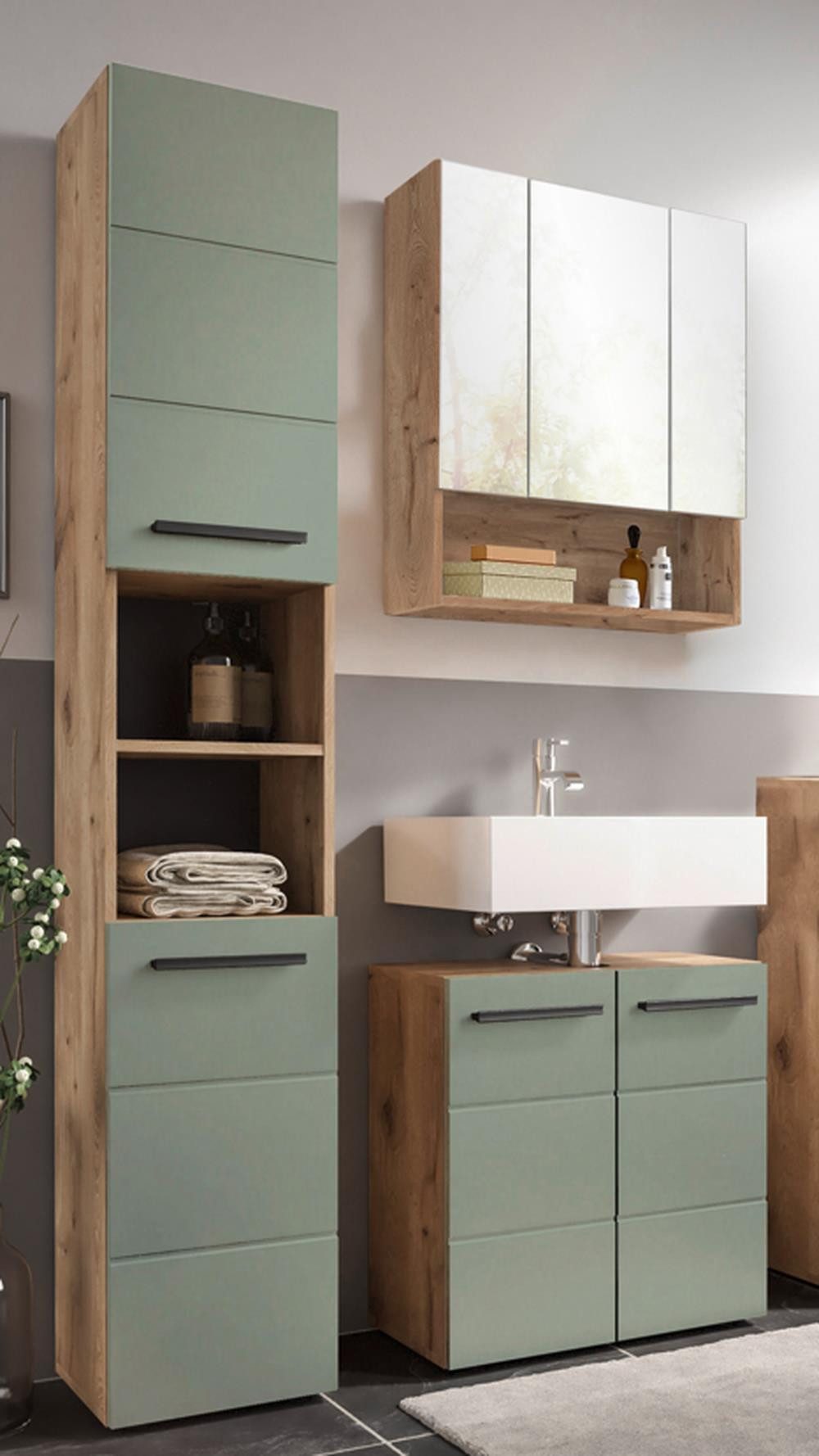 Set beinhaltet | bestehend aus: Waschbeckenunterschrank B/H/T 60x62x31 cm , Spiegelschrank B/H/T 65x71x20 cm, Hochschrank B/H/T 34x190x31 cm |