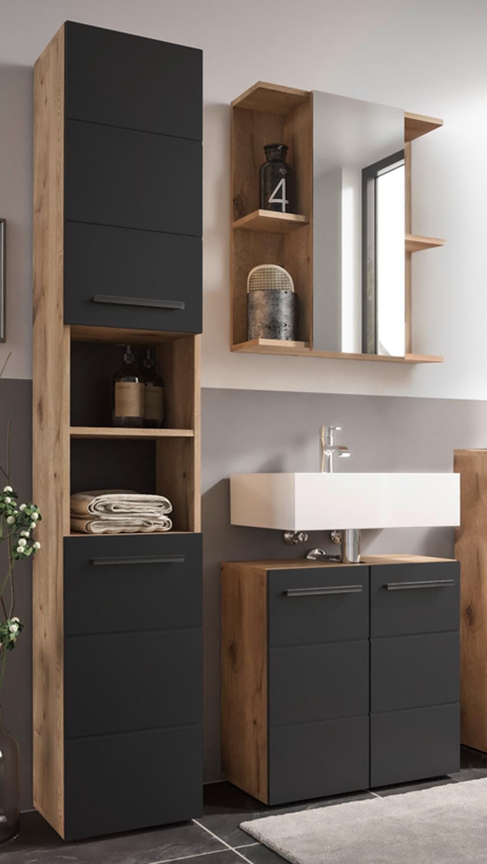 Set beinhaltet | bestehend aus: Waschbeckenunterschrank B/H/T 60x62x31 cm , Spiegelschrank B/H/T 60x71x20 cm, Hochschrank B/H/T 34x190x31 cm |