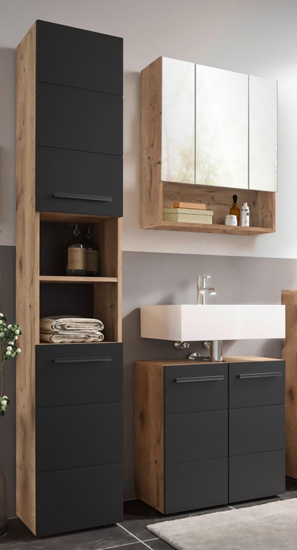 Set beinhaltet | bestehend aus: Waschbeckenunterschrank B/H/T 60x62x31 cm , Spiegelschrank B/H/T 65x71x20 cm, Hochschrank B/H/T 34x190x31 cm |