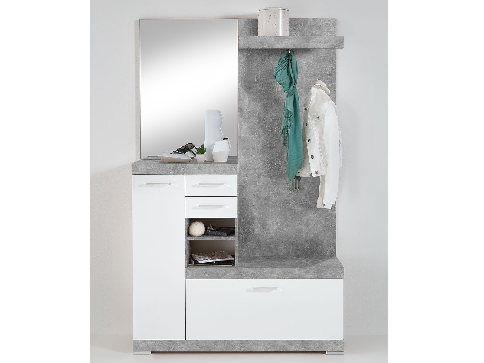 Die Kompaktgarderobe "Birkenhead I" ist hier in moderner Beton LA Nachbildung erhältlich, welche stilvoll mit elegantem Weiß Edelglanz kombiniert wird. Die beide Farben bilden einen tollen optischen Kontrast zueinander, welcher für eine besonders gefällige Ausstrahlung sorgt. Die Betonnachbildung ist qualitativ sehr hochwertig mit täuschend echter Struktur.