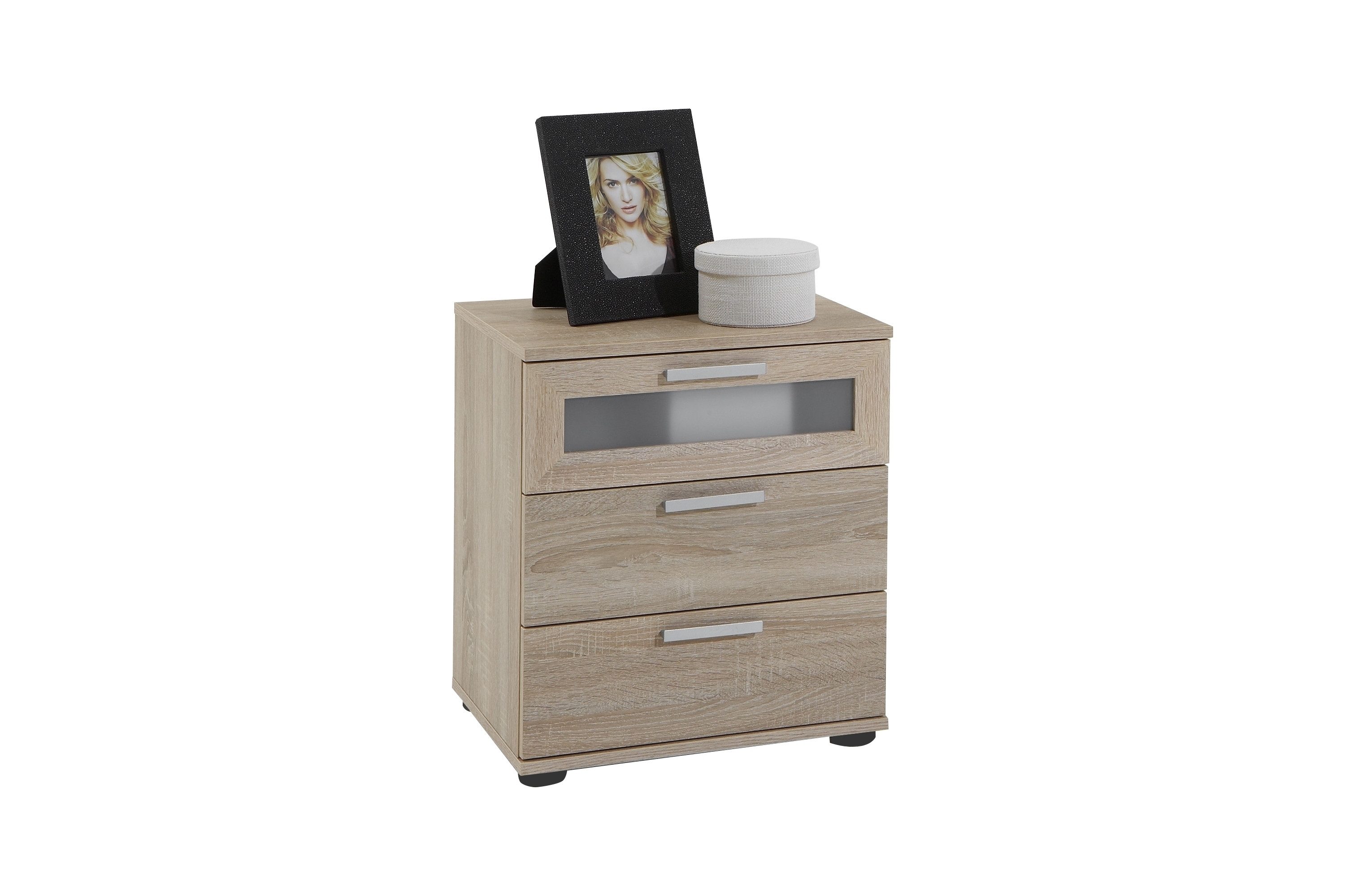 Ausgestattet mit drei geräumigen Schubladen, Metallauszügen und eleganten Griffleisten aus chrom mattem Kunststoff, bietet der Nachttisch nicht nur Funktionalität, sondern auch mod
