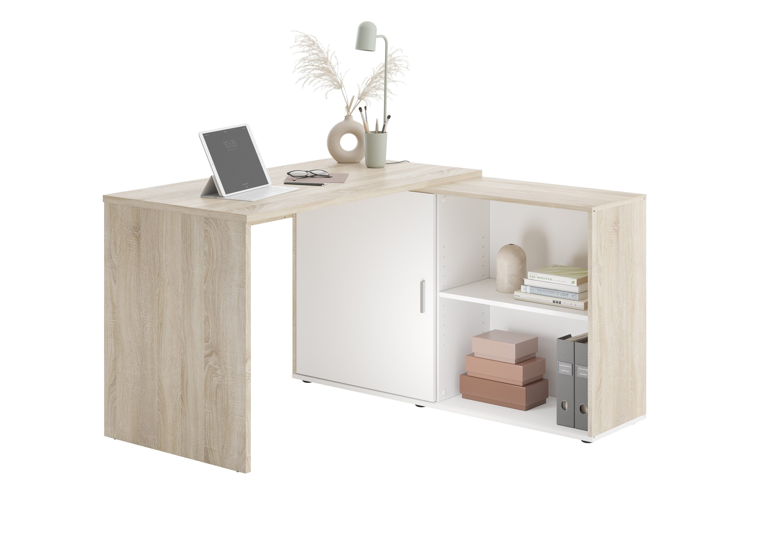Hergestellt in Deutschland aus hochwertiger Spanplatte mit Eiche Dekor-weiß, harmoniert er perfekt mit modernen Einrichtungsstilen und verleiht jedem Raum ein stilvolles Ambiente.