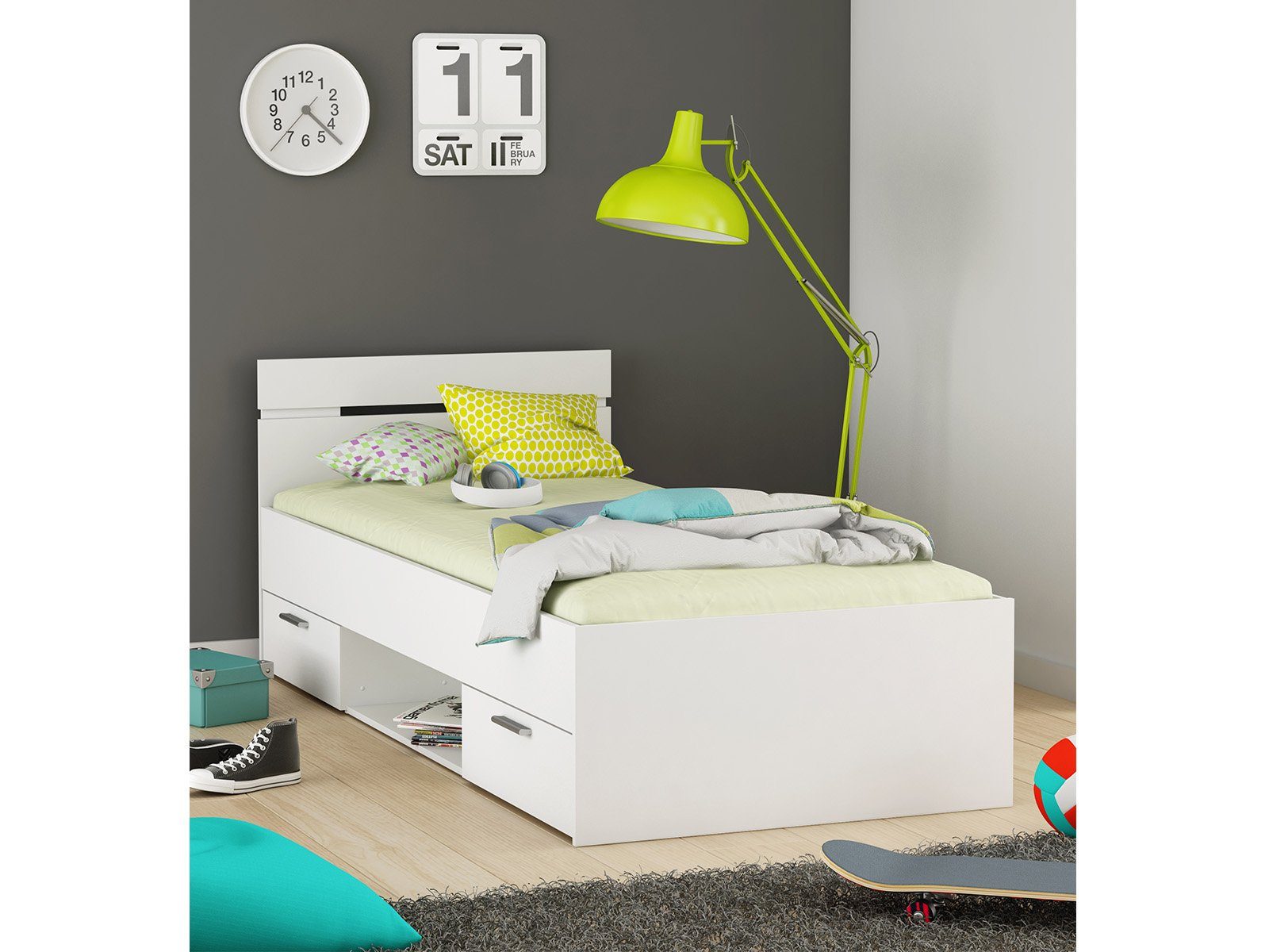 Die Bettanlage mit Maßen von 94,5 cm x 74,2 cm x 204,3 cm bietet dir nicht nur eine komfortable Liegefläche von 90 cm x 200 cm sondern auch durchdachten Stauraum. Ein offenes Ablagefach sowie zwei Schubladen auf Metallauszugsschienen halten viel Platz bereit um auch in kleinen Schlafräumen Ordnung zu halten und Gemütlichkeit aufkommen zu lassen.