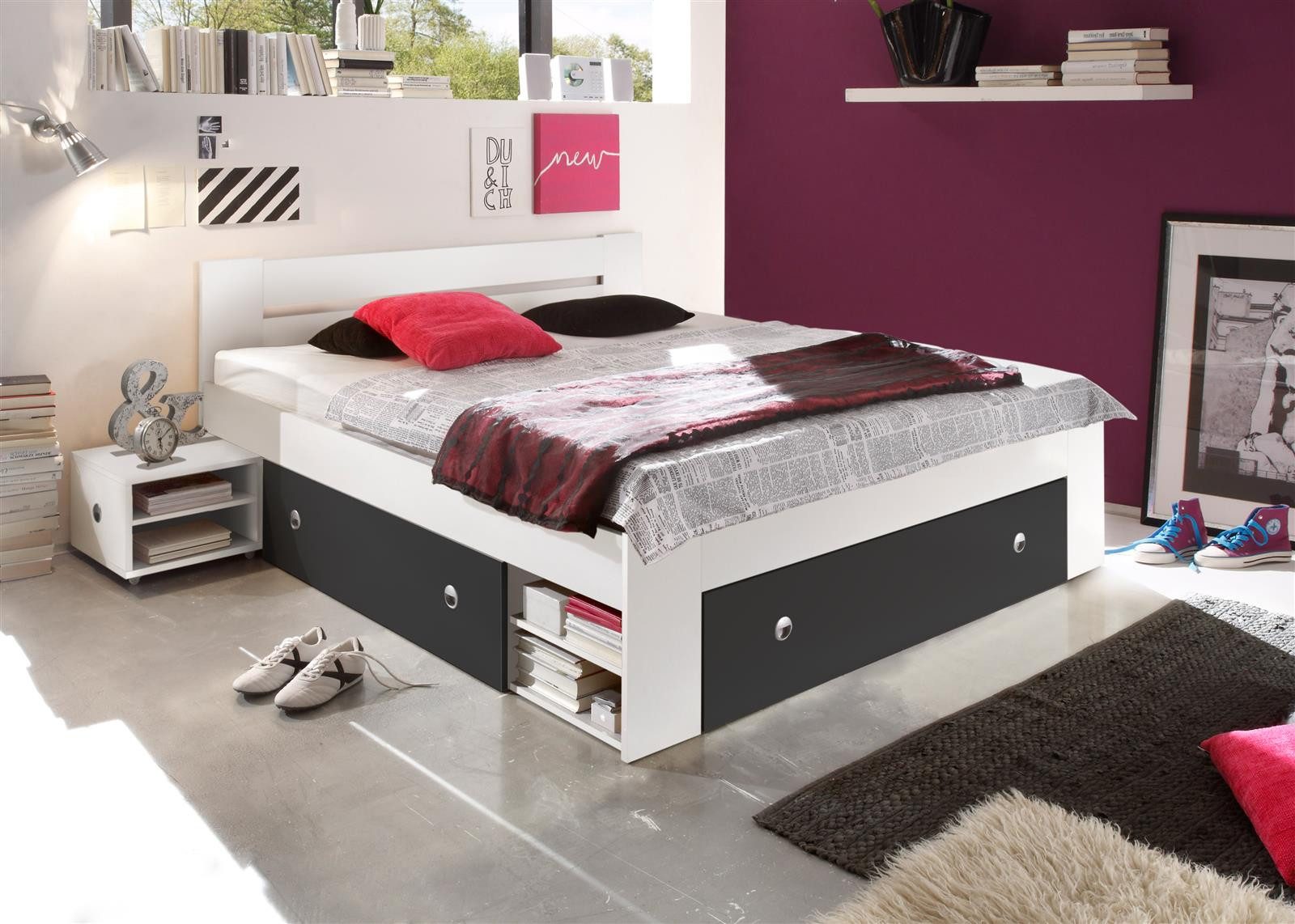 Das moderne Bett bietet ausreichend Platz zum Schlafen und Entspannen. Durch sein schlichtes Design lässt es sich in beinahe jeden Einrichtungsstil integrieren. Die zwei Nachtkommoden und die drei geräumigen Schubkästen bieten viel Stauraum und sorgen für Ordnung. Die Farbgestaltung ermöglicht vielseitige Kombinationsmöglichkeiten mit verschiedenen Einrichtungsstilen.