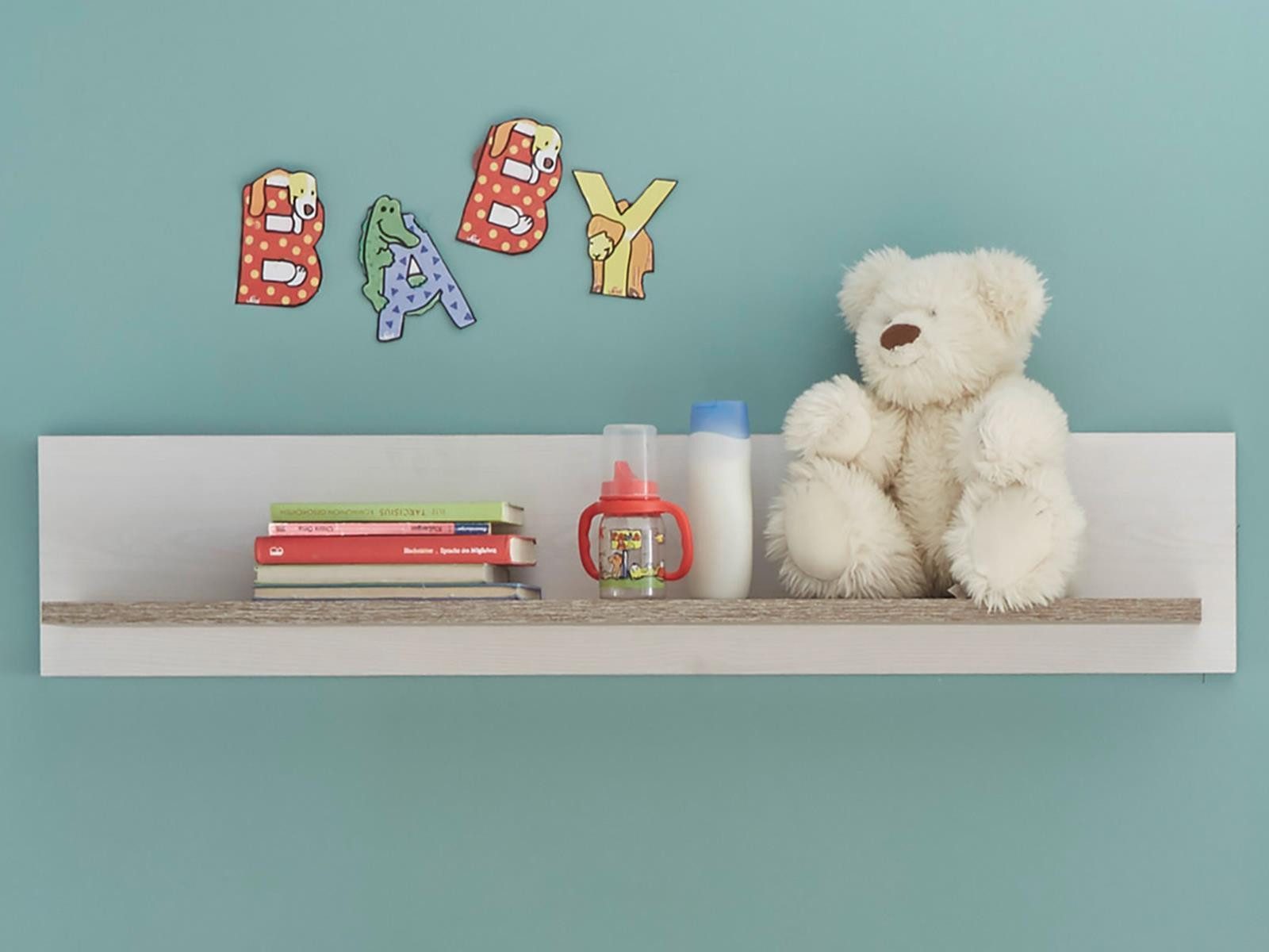Das Wandregal "Lebbie I" ist in stilvoller Pinie Weiß Nachbildung gehalten, welche mit behaglicher Trüffel Nachbildung kombiniert wird. Dank dieser Farbgebung wird dem Kinderzimmer ein freundliches Erscheinungsbild verliehen, welches für Harmonie sorgt ohne dabei erdrückend zu wirken. Die Holznachbildung wirkt besonders realistisch und ist von echter Pinie kaum zu unterscheiden.