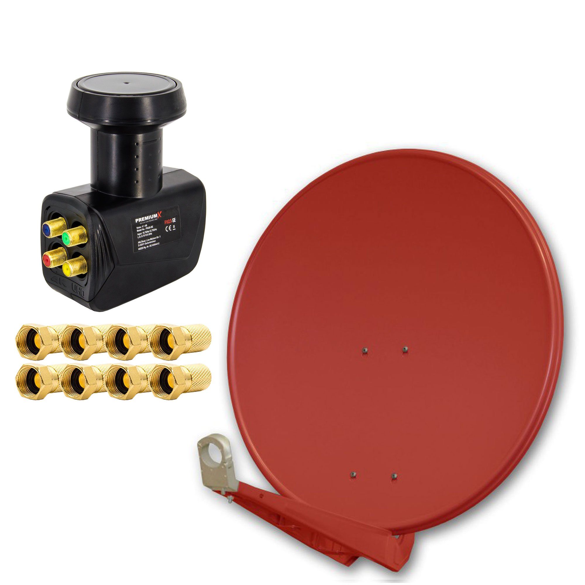 Lieferumfang | 1x SAT-Schüssel DELUXE 80 von PremiumX in Farbe Ziegelrot1x Das Rückenteil mit Muttern 1x Feedarm aus Aluminium mit LNB-Halterung1x PremiumX Quad LNB für 4 Teilnehmer 8x 7mm F-Stecker in Farbe "Gold" mit Dichtring |