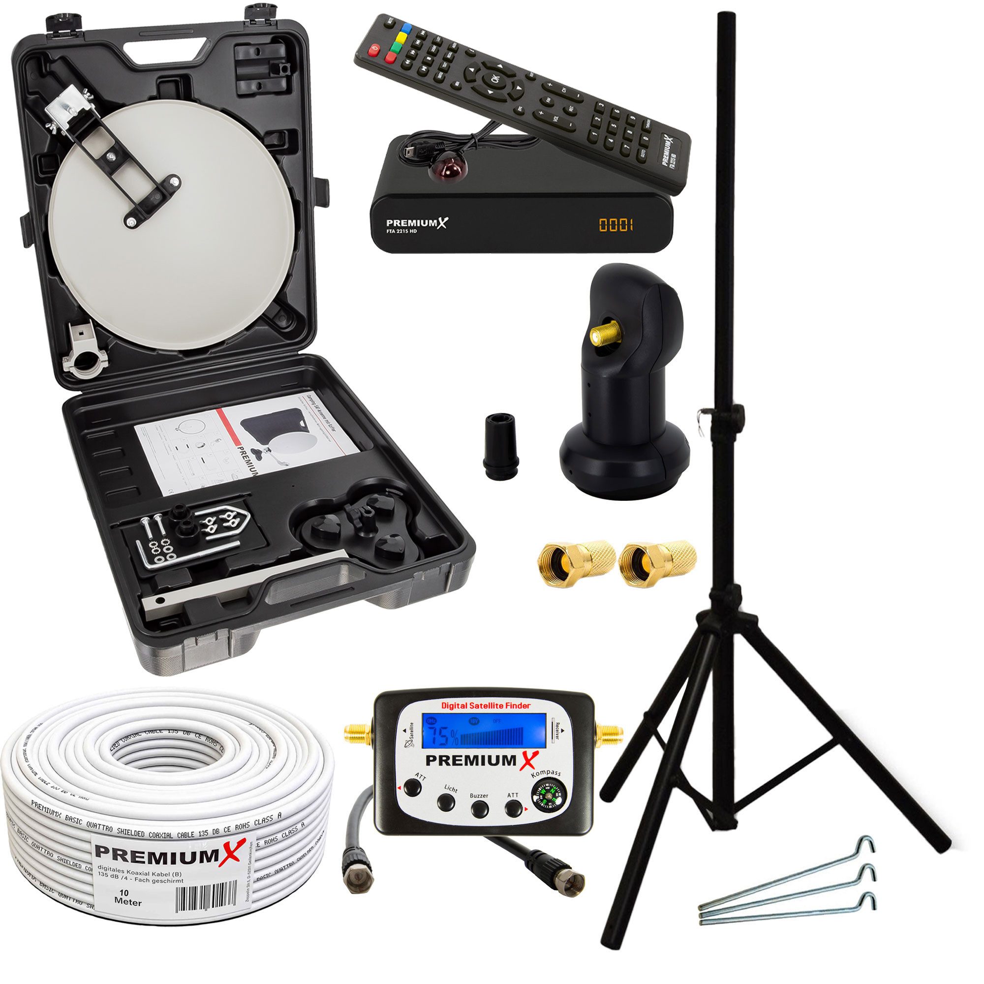 Lieferumfang | 1x Kunststoffkoffer,1x Sat-Antenne,1x LNB-Halter,1x Tischhalter,1x Masthalter,1x Saugfuß,1x Kurzanleitung,1x Singe LNB,1x 10 m Kabel,2x F-Stecker,1x Sat-Finder,1x HD Receiver,1x Stativ,3x Stahl-Heringe |