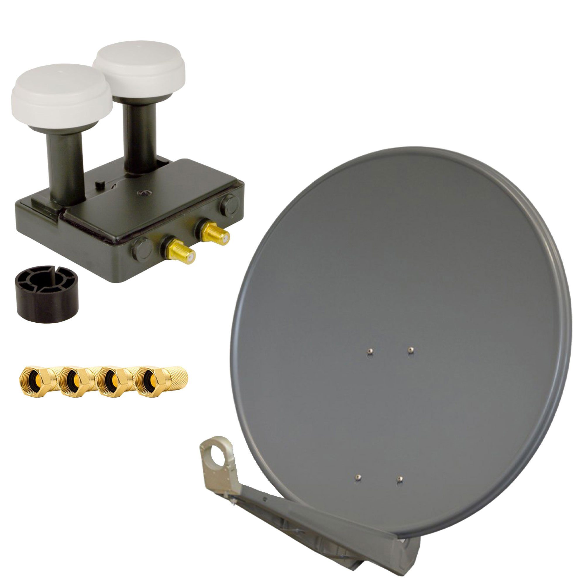 Lieferumfang | 1x SAT-Schüssel DELUXE 85 von PremiumX in Farbe Anthrazit1x Das Rückenteil mit Muttern 1x Feedarm aus Aluminium mit LNB-Halterung1x PremiumX Monoblock TWIN LNB 0,1dB Astra 19,2° Hotbird 13°1x F-Stecker in Farbe "GOLD" |