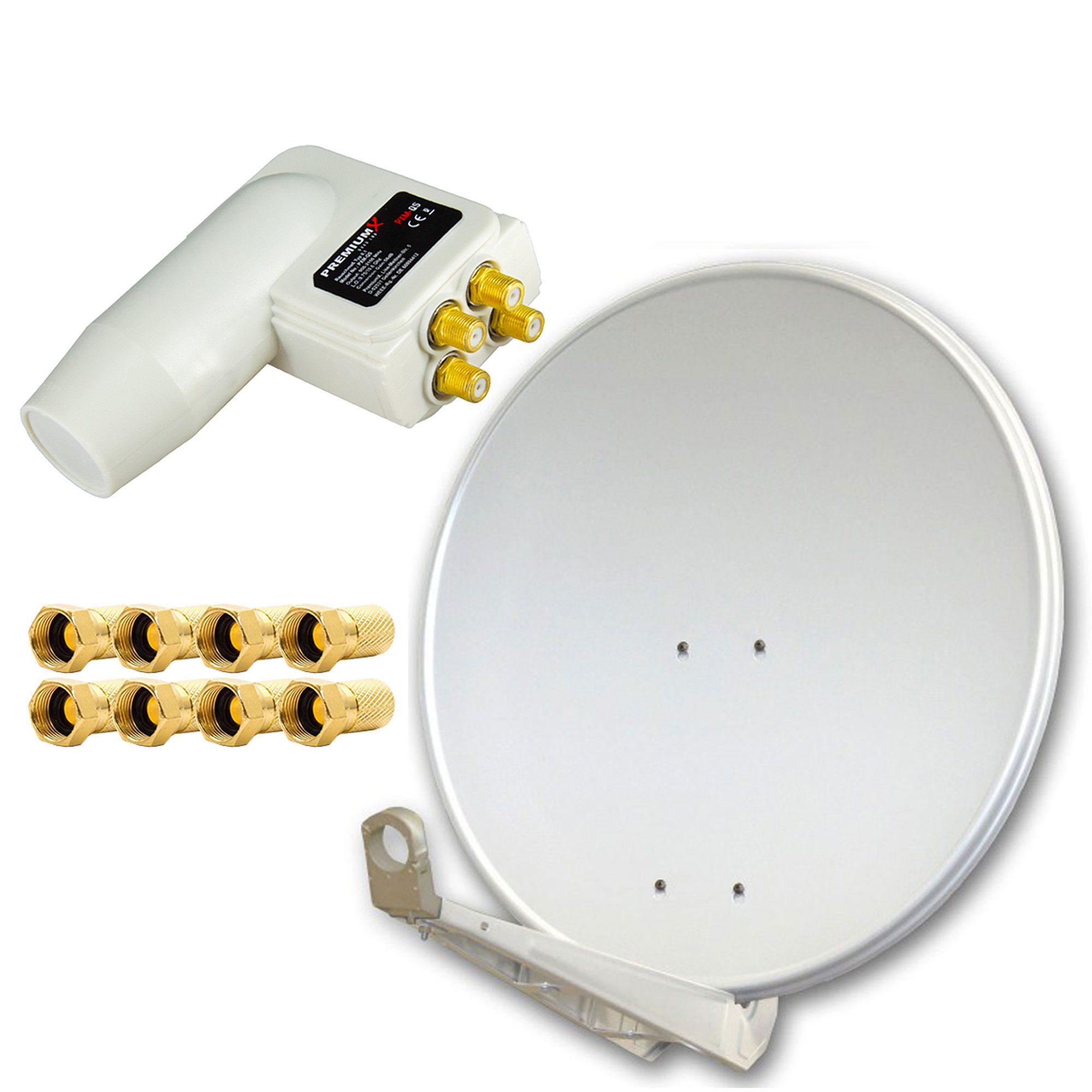 Lieferumfang | 1x PremiumX DELUXE 85 Hellgrau1x Rückenteil mit Muttern1x Feedarm aus Aluminium mit LNB-Halterung1x PremiumX Quad LNB Weiß8x F-Stecker mit Dichtring |