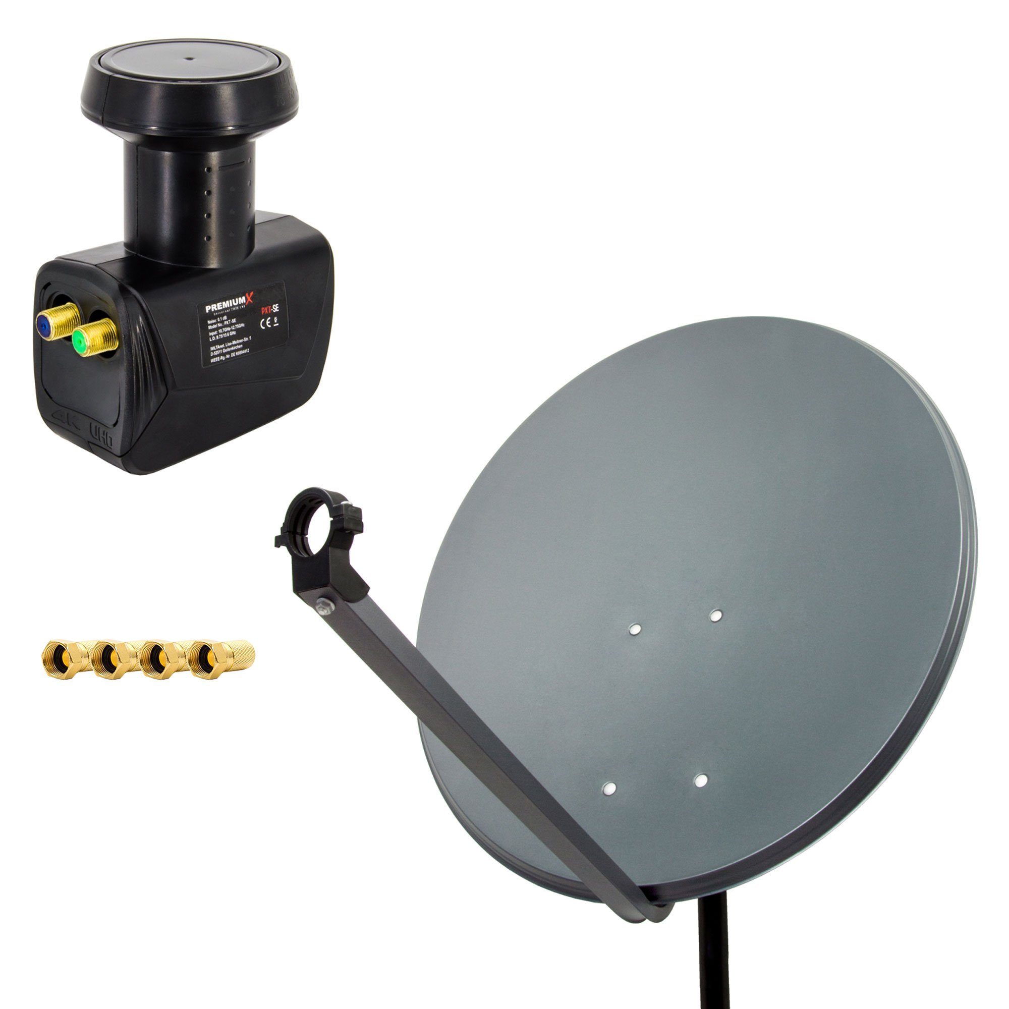 Lieferumfang | 1x PremiumX PXA80 Antenne Alu Anthrazit1x PremiumX PXT-SE Twin LNB4x F-Stecker 7,5mm mit Dichtring |