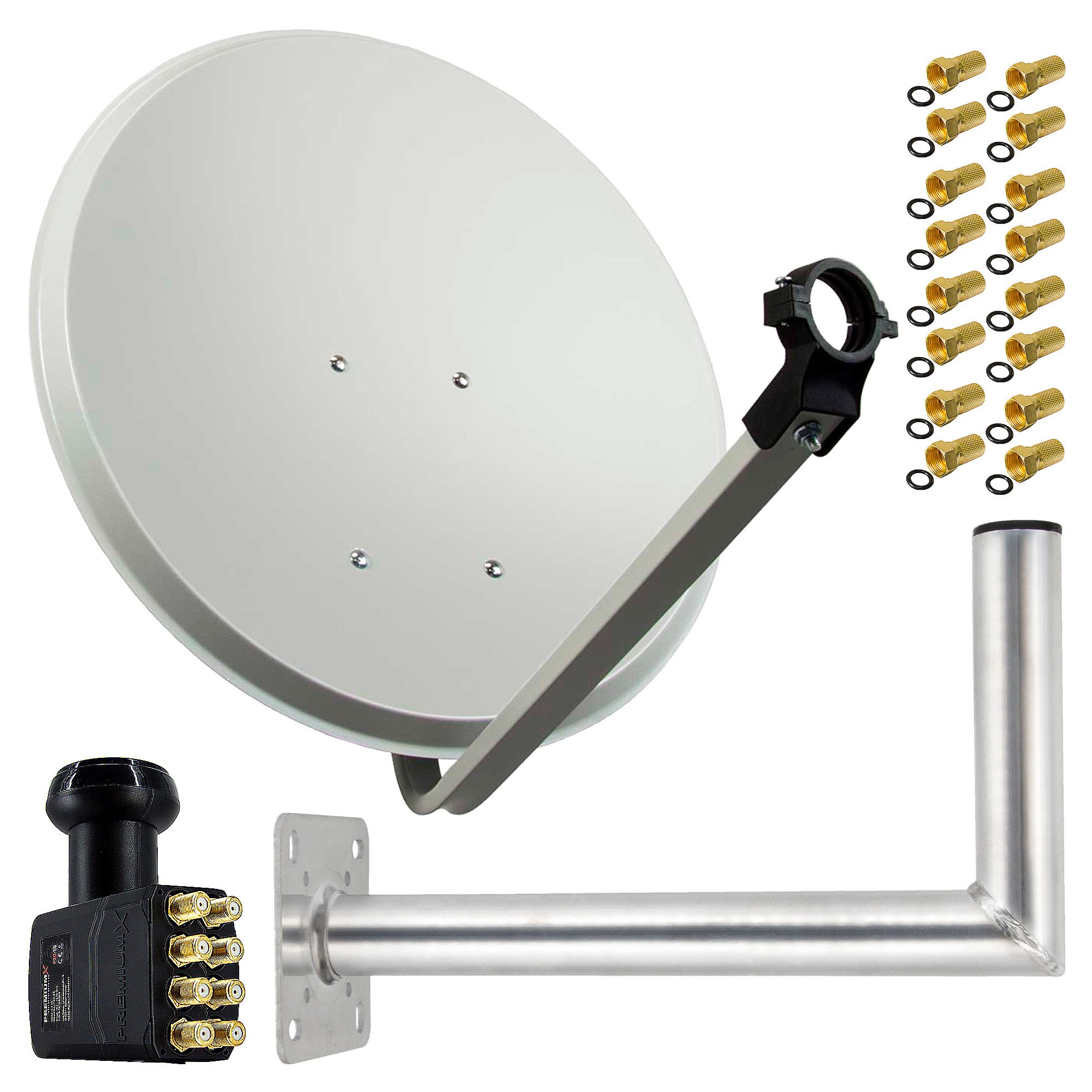 Lieferumfang | 1x PremiumX PXS80 Antenne Stahl Hellgrau,1x PremiumX PXO-SE Octo LNB,1x PremiumX Wandhalter 45 cm Alu,16x F-Stecker 7,5 mm mit Dichtring |