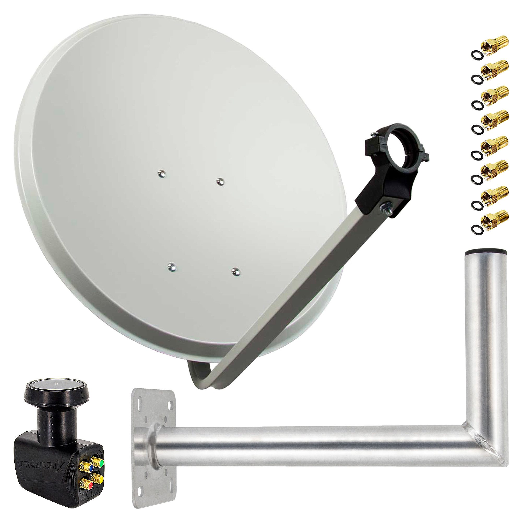 Lieferumfang | 1x PremiumX PXS80 Antenne Stahl Hellgrau,1x PremiumX PXQS-SE Quad LNB,1x PremiumX Wandhalter 45 cm Alu,8x F-Stecker 7,5 mm mit Dichtring |