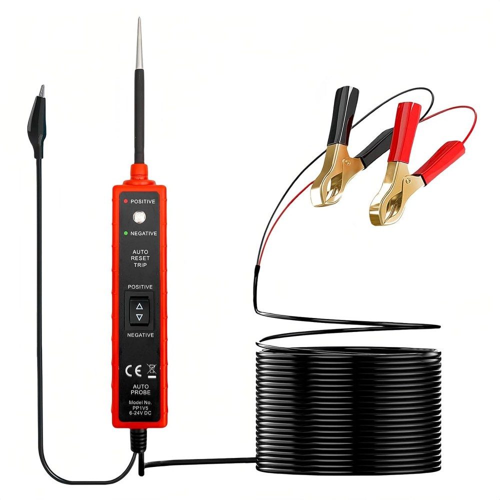 Das Gehäuse dieses Stromkreisprüfers besteht aus langlebigem, hitze- und feuchtigkeitsbeständigem ABS-Material. Er ist für die Arbeit an allen 6-24V DC Kraftfahrzeugelektriken konzipiert und kann an Autos, Lkws, Motorrädern, Booten und Anhängern verwendet werden. Ein automatisch auslösender Schutzschalter mit akustischem Signal schützt das Gerät zuverlässig bei Strömen über 7A.