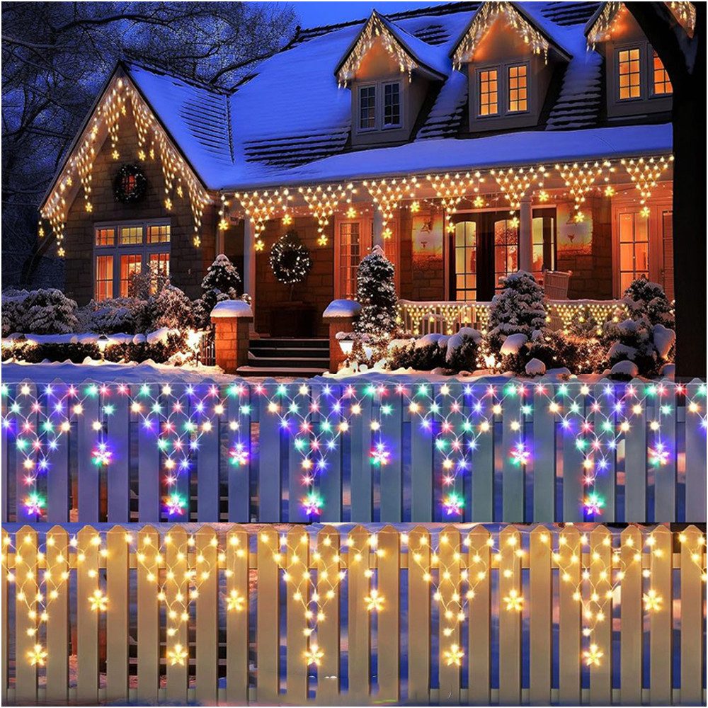 Entdecken Sie unsere neuartige Weihnachtsbeleuchtung für 2024! Das Set umfasst eine 400 cm lange Hauptleitung, an der 11 einzelne Lichterketten befestigt sind. Diese setzen sich zusammen aus 5 umgekehrten dreieckigen Netzlichtern mit einem schönen Sternenboden und 6 elegant herabhängenden Sternen-Lichterketten. Insgesamt erstrahlen 200 superhelle LEDs in festlichem Glanz. Jede der 11 Ketten ist 70 cm lang, und das gesamte Set wird durch ein großzügiges 300 cm langes Anschlusskabel mit Stecker komplettiert.