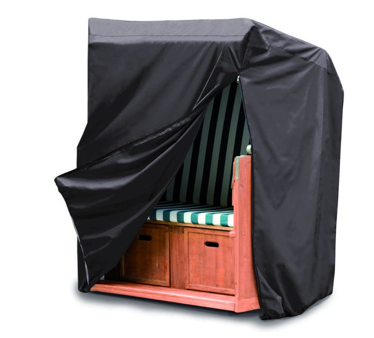 Produktdetails: Zum Schutz vor UV-Strahlen, Nässe, Staub und Schmutz | geeignet für Strandkörbe bis 1,30 cm | Maße: 130 x 100 x 134 - 170 cm (L x B x H) | Material: hochwertiges Polyestergewebe | Farbe: grau | Befestigung: zum Überziehen mit Reißverschluss und Tunnelzugsystem mit Kordelstopper | UV-beständig, wasserabweisend, strapazierfähig |