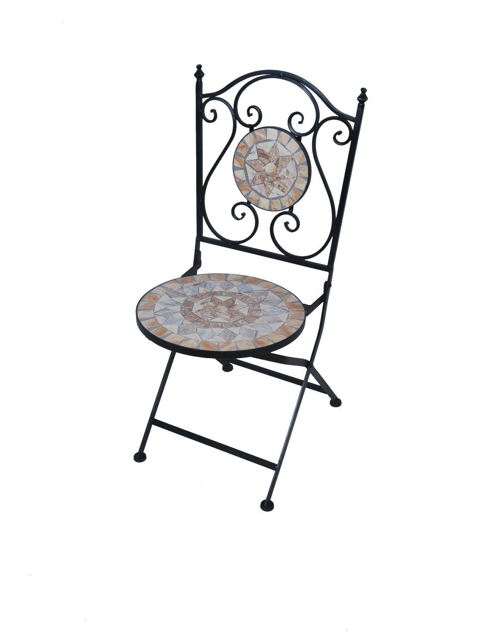Produktdetails: Klappbar und platzsparend verstaubar | hochwertiger Eisen-Rahmen | Maße: 93 x 46 x 39 cm (H x T x B) | Sitzhöhe: ca. 43 cm | Farbe: schwarz mit Mosaik | Anzahl der Sitzplätze: 1 | max. Belastbarkeit: 110 kg | witterungs- und frostbeständig | Lieferumfang: 1 x Stuhl | im Winter bitte trocken lagern |