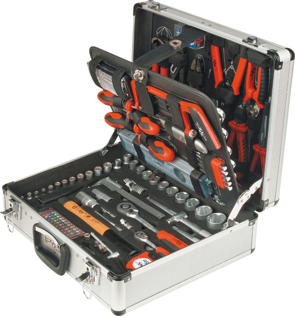 Produktdetails: 10 x Kabelbinder, 40 x Kabelschuhe, 1 x Cuttermesser, 1 x Maßband, 1 x Handsäge, 3 x Ersatz-Sägeblätter, 1 x Wasserwaage 30 cm, 1 x Hammer 300 g mit Holzstiel, 1 x Schieblehre 15 cm, 1 x Feile, 5 x Meißeln, 1 x Blechschere | 9 x Sechskantschlüssel, 9 x Gabel-Ringschlüssel, 4 x Schraubendreher, 4-teiliges-Schraubendreher-Set, 8 x Zangen | 2 x Ratschen, 26 x Steckschlüssel-Einsätze, 2 x Kardangelenke, 4 x Verlängerungen, 1 x Handgriff, 2 x Adapter, 5 x Zubehör, 1 x T-Griff, 31 x Bits, 1 x Bit-Adapter, 3 x Aufsätze Sicherungszange | Material: Chrom-Vanadium-Stahl | 1 x Kabelschuh-Klemm-Abisolierzange, 1 x Rollgabelschlüssel, 1 x Kombizange, 1 x Seidenschneider, 1 x Telefonzange, 1 x Wasserpumpenzange, 1 x Kneifzange, 1 x Sicherungszange, 2 x Schlitzschraubendreher SL6,5 x 100, SL5,5 x 75 mm, 2 x Kreuzschraubendreher PH1 x 75, PH2 x 100 mm | 1 x Ratsche 1/2", 1 x Kardangelenk 1/2", 2 x Verlängerung 1/2" (125 mm und 250 mm), 2 x Adapter 1/2", 1 x Zubehör 1/2", 13 x Steckschlüssel-Einsätze 1/2": 10 mm, 13 mm, 14 mm, 16 mm, 17 mm, 18 mm, 19 mm, 20 mm, 22 mm, 24 mm, 27 mm, 30 mm, 32 mm | 1 x Ratsche 1/4", 2 x Verlängerung 1/4"(50 mm und 100 mm), 1 x Kardangelenk 1/4", 1 x T-Griff 1/4", 4 x Zubehör 1/4", 13 x Steckschlüssel-Einsätze 1/4": 4 mm, 4,5 mm, 5 mm, 6 mm, 7 mm, 8 mm, 9 mm, 10 mm, 11 mm, 12 mm, 13 mm, 14 mm | 31 x Bits Kreuz, Innenstern (TX), Schlitz, Sechskant 1/4": PH0, PH1, PH2, Ph3, PH4, PZ0, PZ1, PZ3, PZ4, T10, T15, T20, T25, T27, T30, SL3, SL4, SL4,5, SL5, SL5,5, SL6, SL7, SK1,5, SK2, SK2,5, SK3, SK4, SK5, SK6, 1 x Bit-Adapter 1/4" | mit praktischem Aufbewahrungskoffer |