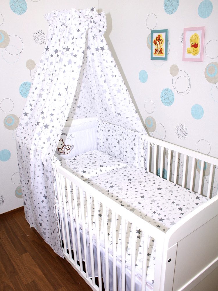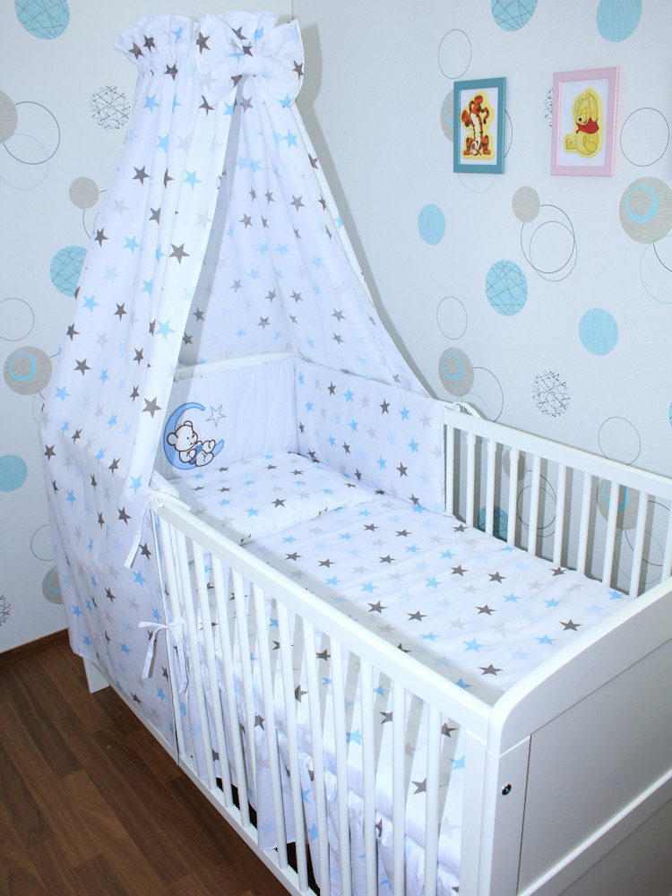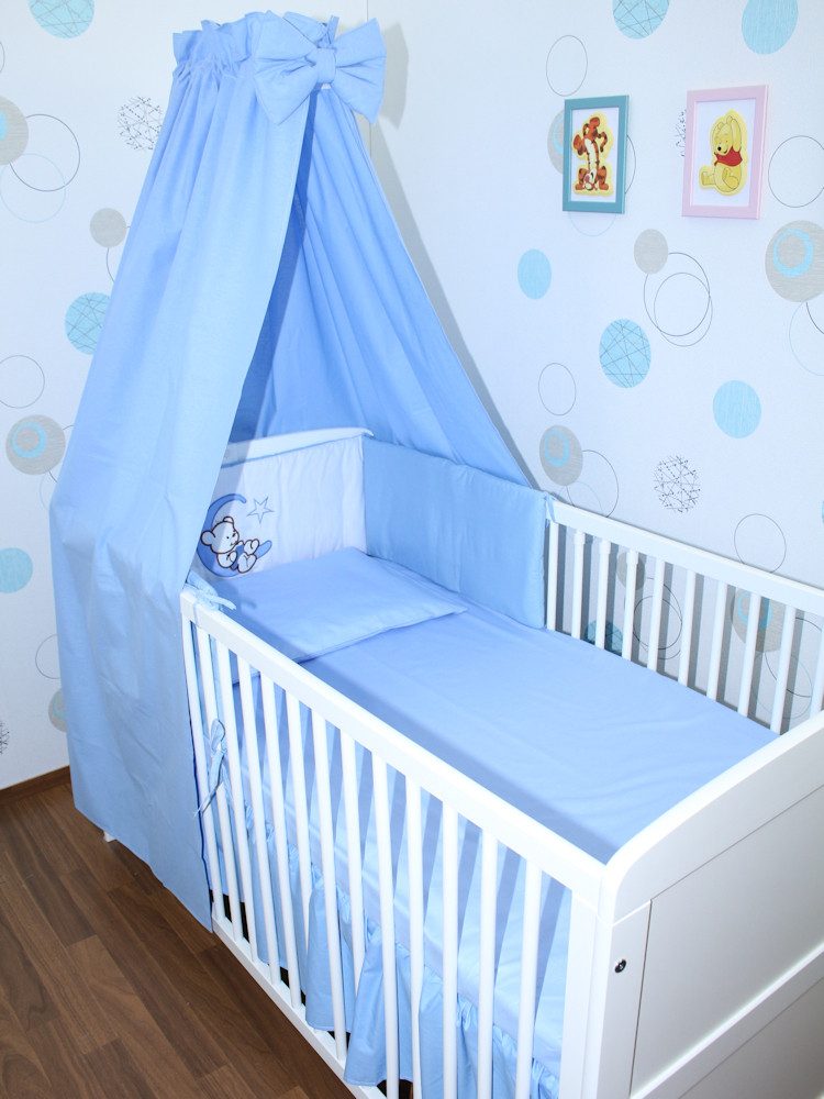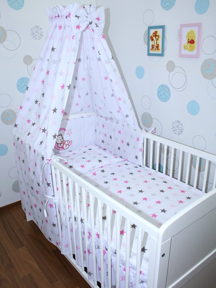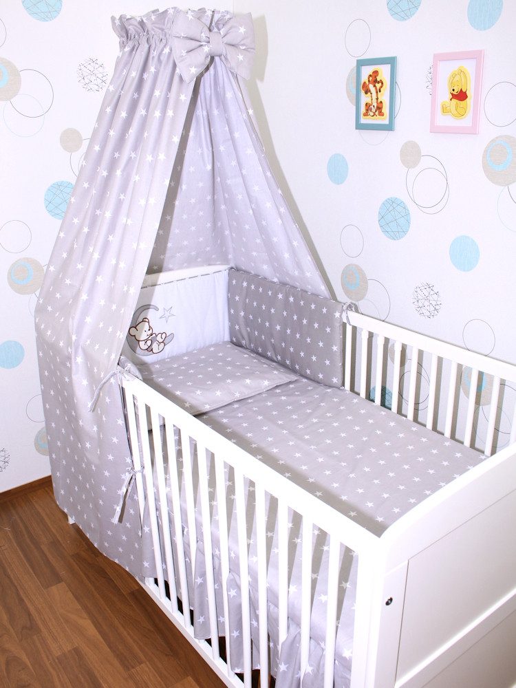 5 teiliges-1. Deckenbezug (100 x 135 cm) 2. Kissenbezug (40 x 60 cm) 3. Nestchen mit Applikation (190 x 30 cm) 4. Himmel - Vollstoff 5. Schleife