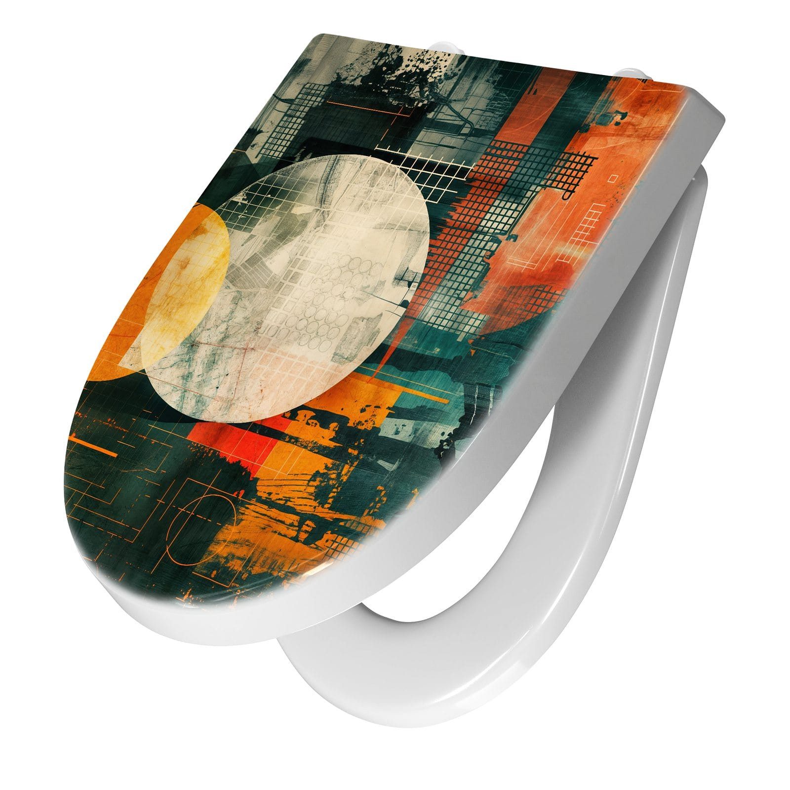 Ein besonderes Highlight ist das brillante Motiv Abstrakte Geometrie, das per UV-Direktdruck auf den WC-Deckel aufgebracht ist. Diese langlebige Drucktechnik sorgt für eine kratzfeste, farbintensive Oberfläche, die auch nach häufigem Gebrauch optisch überzeugt. Dank unserer großen Auswahl an Motiven setzen Sie mit jedem Sitz ein individuelles Design-Statement im Bad.