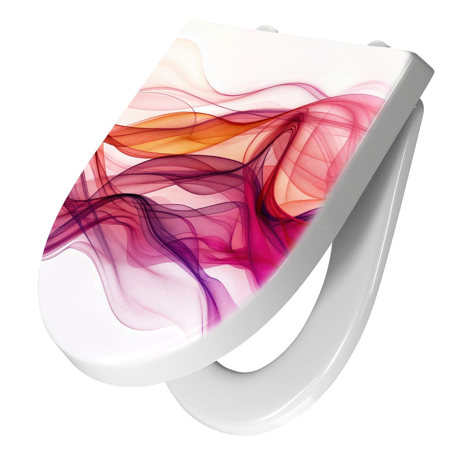 Ein besonderes Highlight ist das brillante Motiv Farbige Schleier, das per UV-Direktdruck auf den WC-Deckel aufgebracht ist. Diese langlebige Drucktechnik sorgt für eine kratzfeste, farbintensive Oberfläche, die auch nach häufigem Gebrauch optisch überzeugt. Dank unserer großen Auswahl an Motiven setzen Sie mit jedem Sitz ein individuelles Design-Statement im Bad.