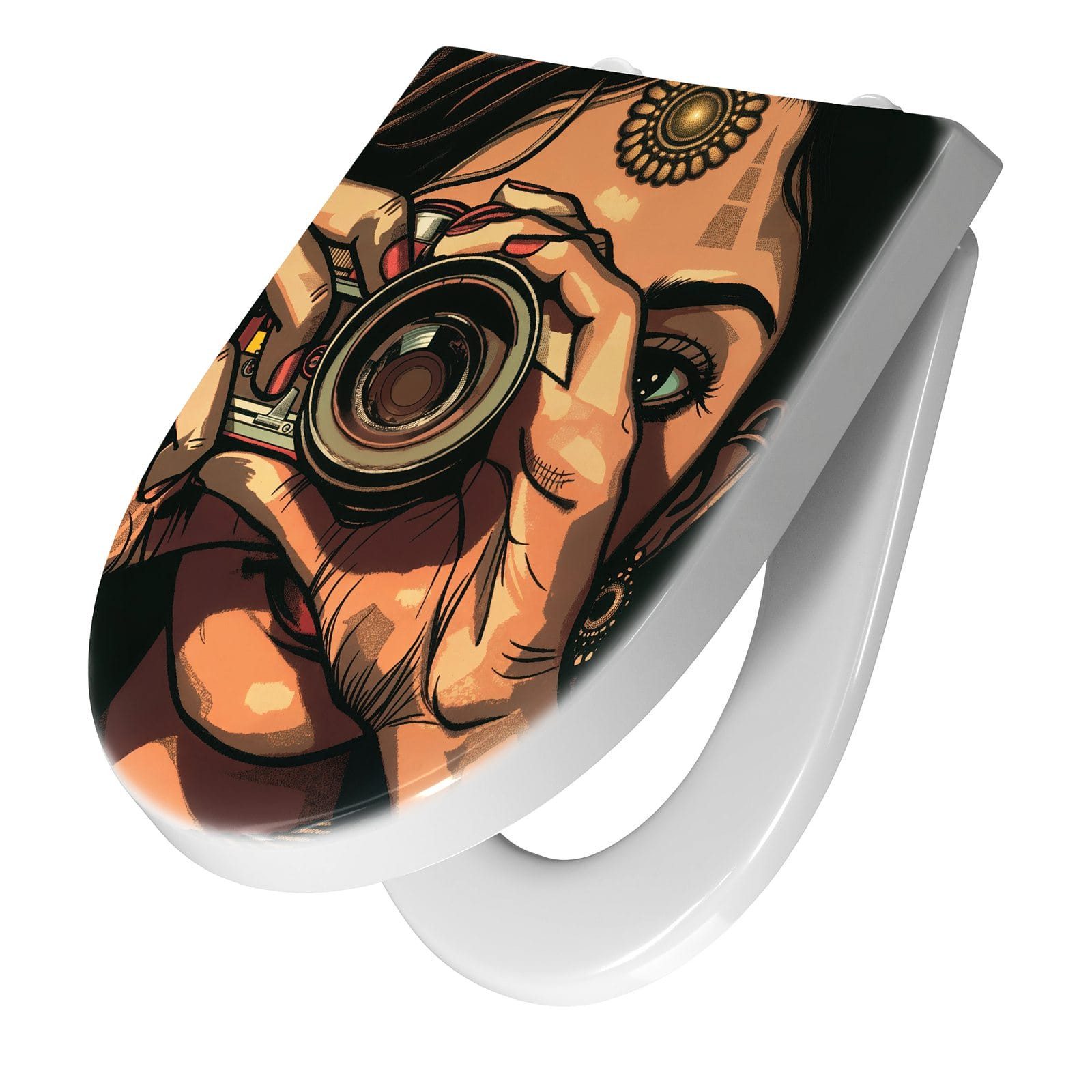 Ein besonderes Highlight ist das brillante Motiv Frau Mit Kamera, das per UV-Direktdruck auf den WC-Deckel aufgebracht ist. Diese langlebige Drucktechnik sorgt für eine kratzfeste, farbintensive Oberfläche, die auch nach häufigem Gebrauch optisch überzeugt. Dank unserer großen Auswahl an Motiven setzen Sie mit jedem Sitz ein individuelles Design-Statement im Bad.