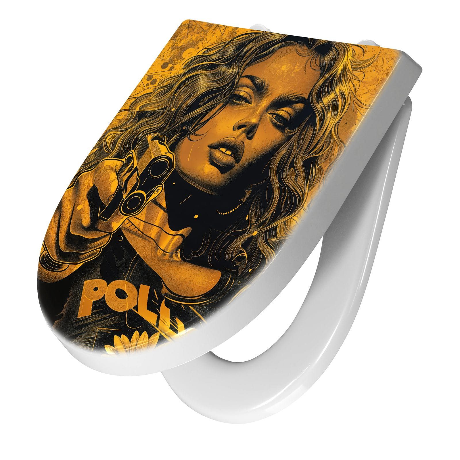 Ein besonderes Highlight ist das brillante Motiv Frau Mit Pistole Kunst, das per UV-Direktdruck auf den WC-Deckel aufgebracht ist. Diese langlebige Drucktechnik sorgt für eine kratzfeste, farbintensive Oberfläche, die auch nach häufigem Gebrauch optisch überzeugt. Dank unserer großen Auswahl an Motiven setzen Sie mit jedem Sitz ein individuelles Design-Statement im Bad.