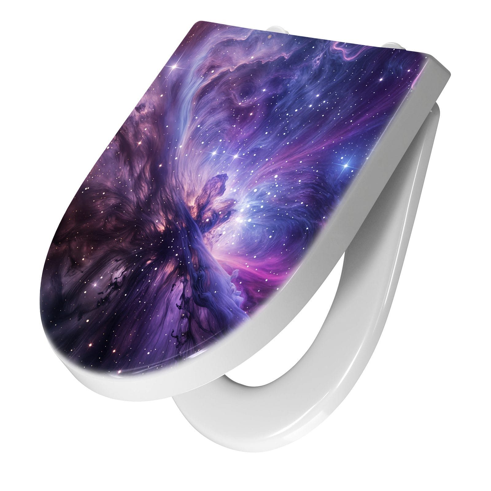 Ein besonderes Highlight ist das brillante Motiv Galaktisches Leuchten, das per UV-Direktdruck auf den WC-Deckel aufgebracht ist. Diese langlebige Drucktechnik sorgt für eine kratzfeste, farbintensive Oberfläche, die auch nach häufigem Gebrauch optisch überzeugt. Dank unserer großen Auswahl an Motiven setzen Sie mit jedem Sitz ein individuelles Design-Statement im Bad.
