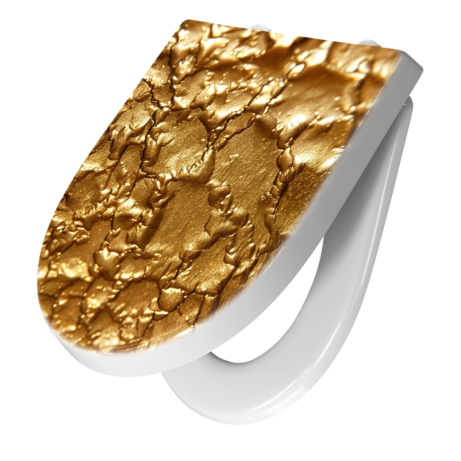 Ein besonderes Highlight ist das brillante Motiv Goldene Struktur, das per UV-Direktdruck auf den WC-Deckel aufgebracht ist. Diese langlebige Drucktechnik sorgt für eine kratzfeste, farbintensive Oberfläche, die auch nach häufigem Gebrauch optisch überzeugt. Dank unserer großen Auswahl an Motiven setzen Sie mit jedem Sitz ein individuelles Design-Statement im Bad.