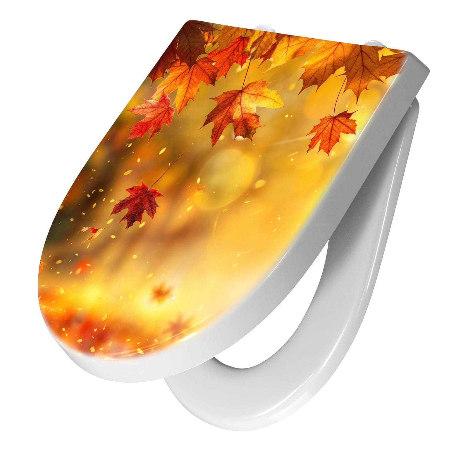 Ein besonderes Highlight ist das brillante Motiv Herbstblätter Sonne, das per UV-Direktdruck auf den WC-Deckel aufgebracht ist. Diese langlebige Drucktechnik sorgt für eine kratzfeste, farbintensive Oberfläche, die auch nach häufigem Gebrauch optisch überzeugt. Dank unserer großen Auswahl an Motiven setzen Sie mit jedem Sitz ein individuelles Design-Statement im Bad.