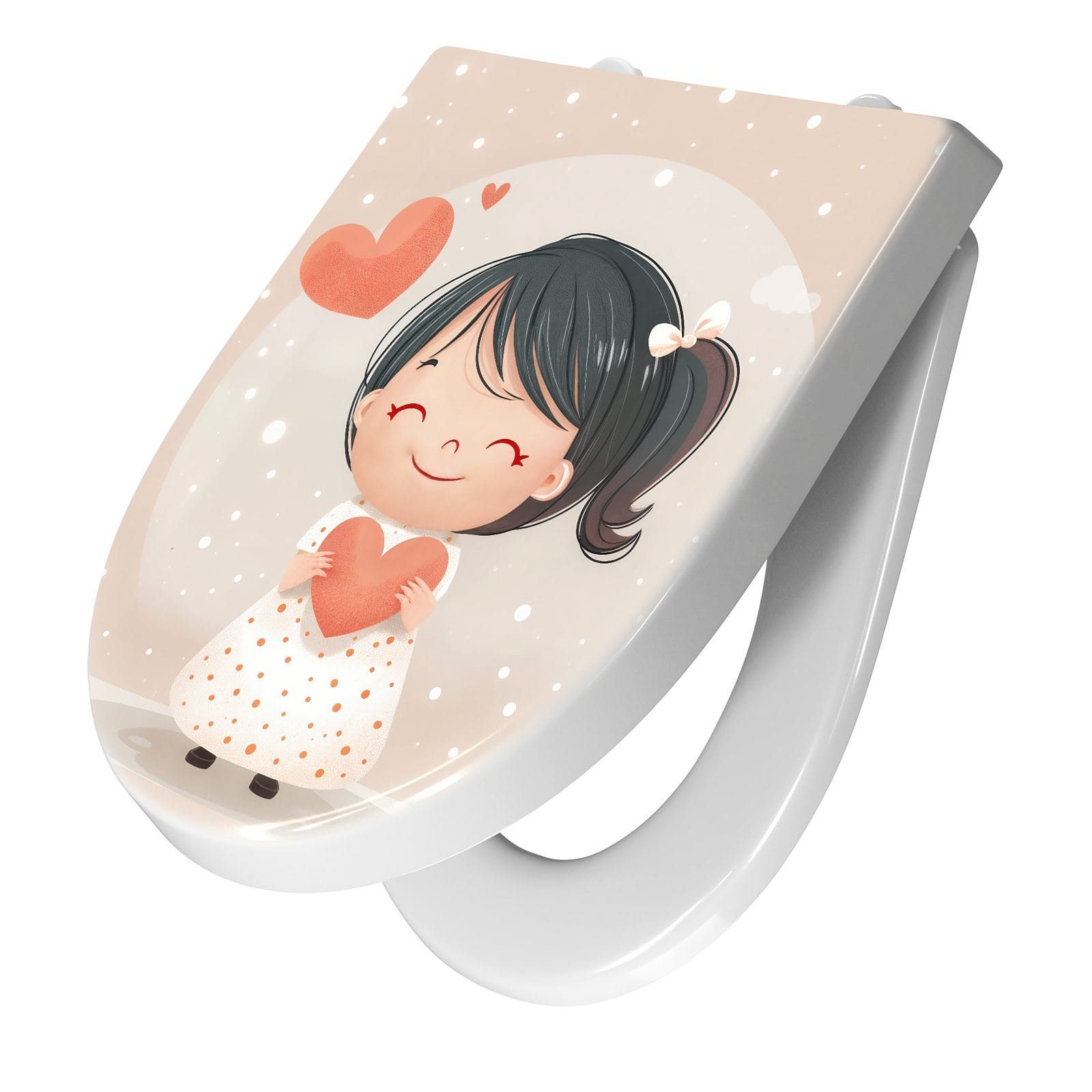 Ein besonderes Highlight ist das brillante Motiv Herziges Maedchen Herz, das per UV-Direktdruck auf den WC-Deckel aufgebracht ist. Diese langlebige Drucktechnik sorgt für eine kratzfeste, farbintensive Oberfläche, die auch nach häufigem Gebrauch optisch überzeugt. Dank unserer großen Auswahl an Motiven setzen Sie mit jedem Sitz ein individuelles Design-Statement im Bad.