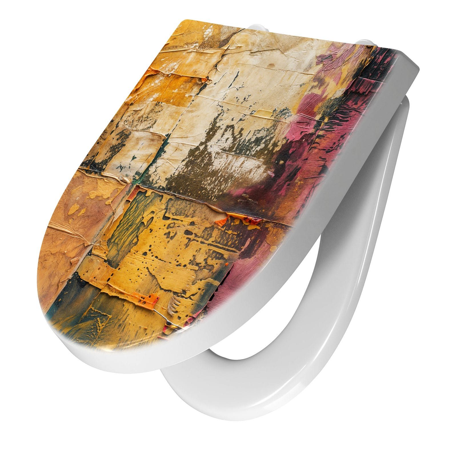 Ein besonderes Highlight ist das brillante Motiv Kunst Collage Textur, das per UV-Direktdruck auf den WC-Deckel aufgebracht ist. Diese langlebige Drucktechnik sorgt für eine kratzfeste, farbintensive Oberfläche, die auch nach häufigem Gebrauch optisch überzeugt. Dank unserer großen Auswahl an Motiven setzen Sie mit jedem Sitz ein individuelles Design-Statement im Bad.