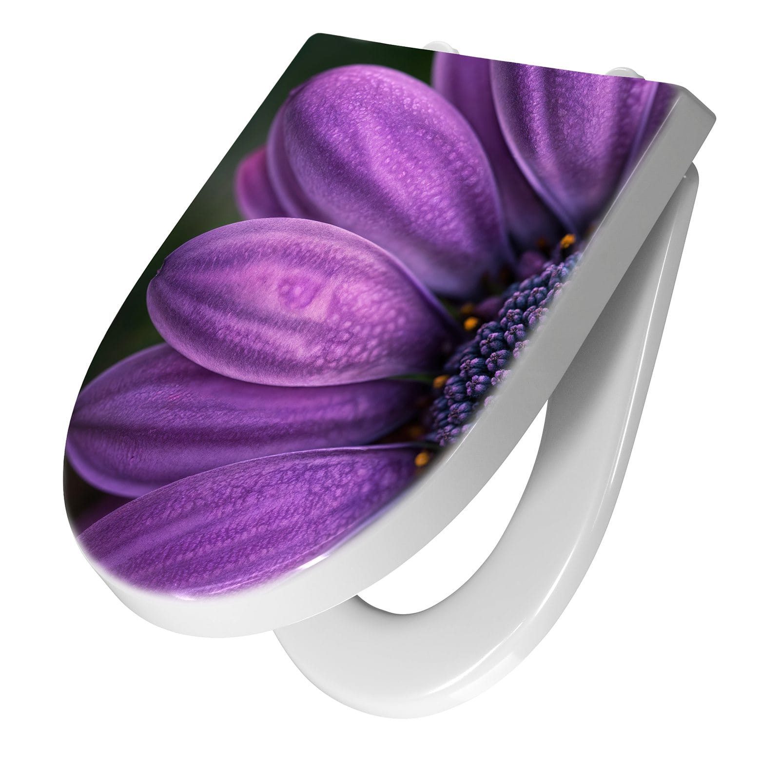 Ein besonderes Highlight ist das brillante Motiv Lila Blütenwunder, das per UV-Direktdruck auf den WC-Deckel aufgebracht ist. Diese langlebige Drucktechnik sorgt für eine kratzfeste, farbintensive Oberfläche, die auch nach häufigem Gebrauch optisch überzeugt. Dank unserer großen Auswahl an Motiven setzen Sie mit jedem Sitz ein individuelles Design-Statement im Bad.
