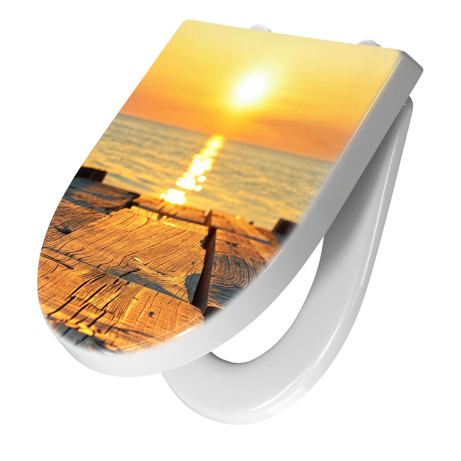 Ein besonderes Highlight ist das brillante Motiv Sonnenuntergang Meer, das per UV-Direktdruck auf den WC-Deckel aufgebracht ist. Diese langlebige Drucktechnik sorgt für eine kratzfeste, farbintensive Oberfläche, die auch nach häufigem Gebrauch optisch überzeugt. Dank unserer großen Auswahl an Motiven setzen Sie mit jedem Sitz ein individuelles Design-Statement im Bad.