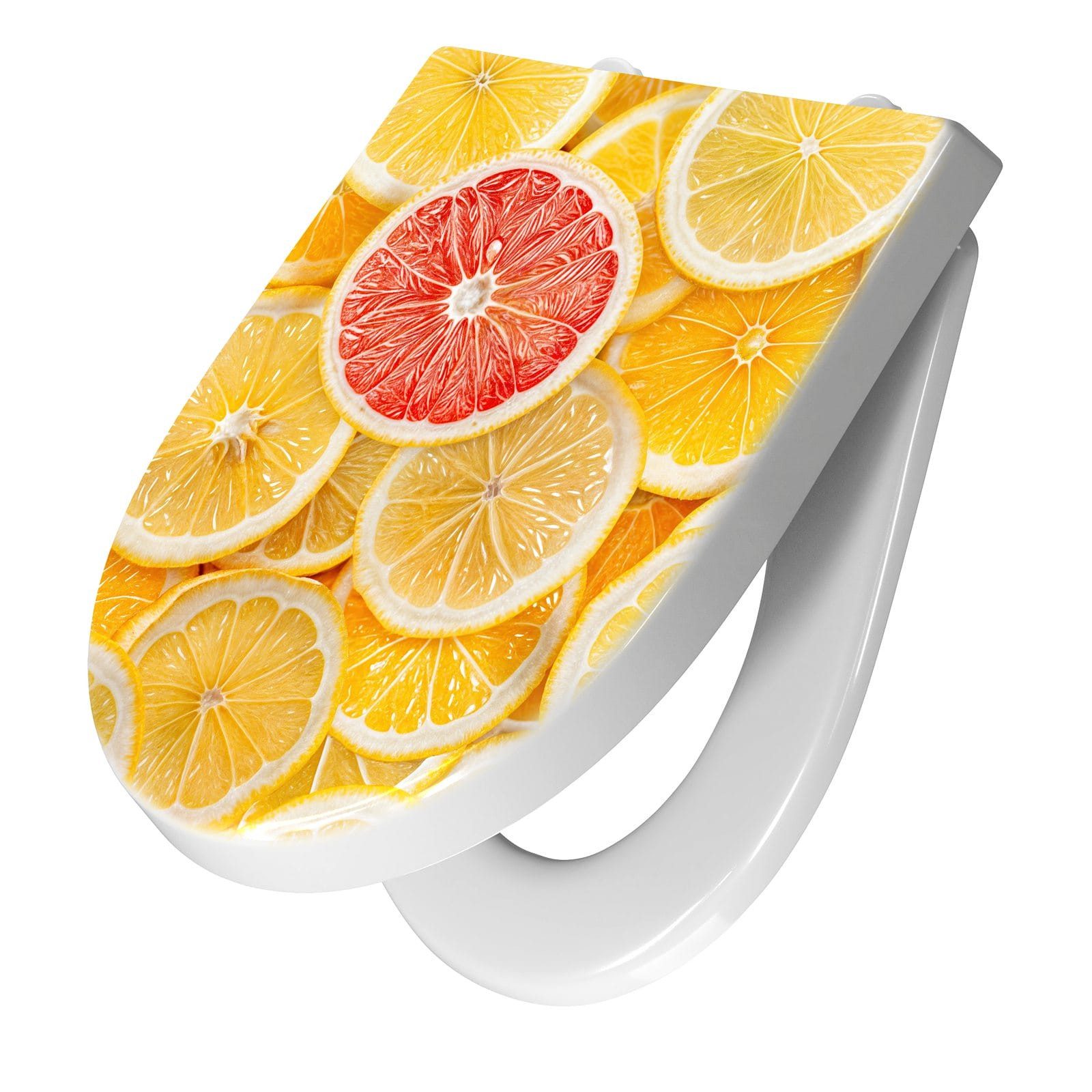 Ein besonderes Highlight ist das brillante Motiv Zitrusfrüchte, das per UV-Direktdruck auf den WC-Deckel aufgebracht ist. Diese langlebige Drucktechnik sorgt für eine kratzfeste, farbintensive Oberfläche, die auch nach häufigem Gebrauch optisch überzeugt. Dank unserer großen Auswahl an Motiven setzen Sie mit jedem Sitz ein individuelles Design-Statement im Bad.