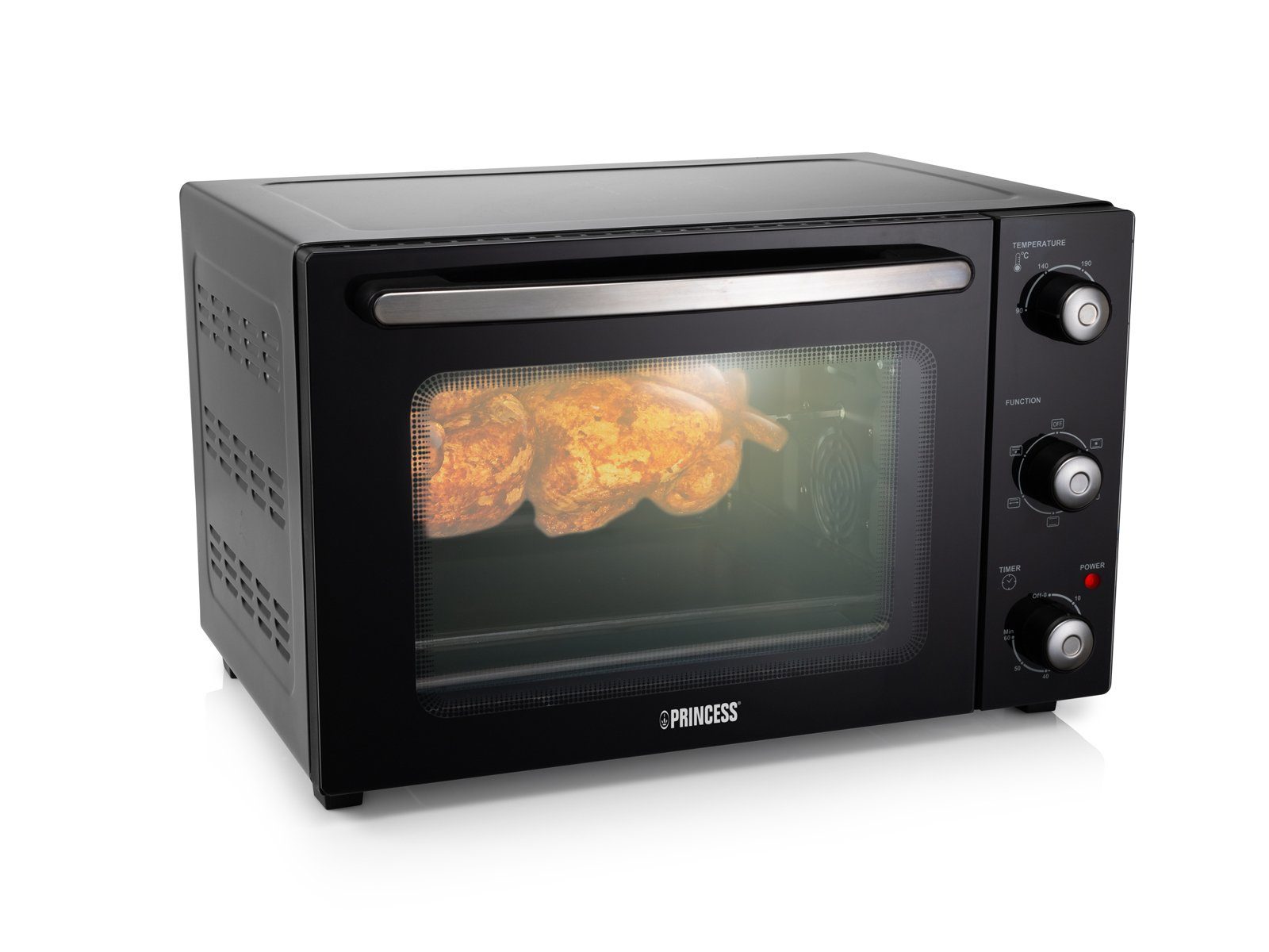 Ausstattung | Wärmeisoliertes Gehäuse Doppelglastür Innenbeleuchtung Regelbarer Thermostat Timer Kontrolllampe Zubehör: Drehspieß, Backblech, Grillrost, Zange |