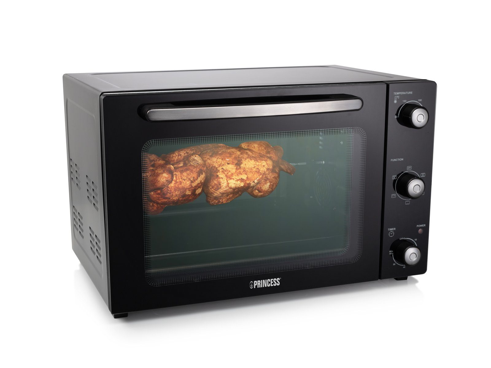 Ausstattung | Wärmeisoliertes Gehäuse Doppelglastür Innenbeleuchtung Regelbarer Thermostat Timer Kontrolllampe Zubehör: Drehspieß, Backblech, Grillrost, Zange |