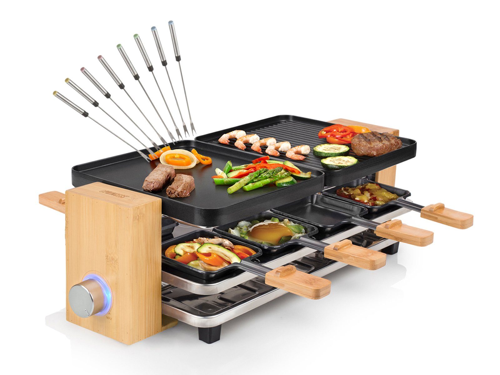 Top-Features | Die wendbaren Griddleplatten haben eine glatte und eine geriffelte Seite, so dass Sie zwischen Grill-, Teppanyaki- und Raclette-Funktion wählen können. Das luxuriöse Design Raclette ist mit seinem Bambusgehäuse ein großartiger Anblick auf jedem Tisch. Die Ablageflächen für die heißen Pfännchen sind sehr praktisch und verhindern Schmutz- und Brandflecken auf Ihrem Tisch. |