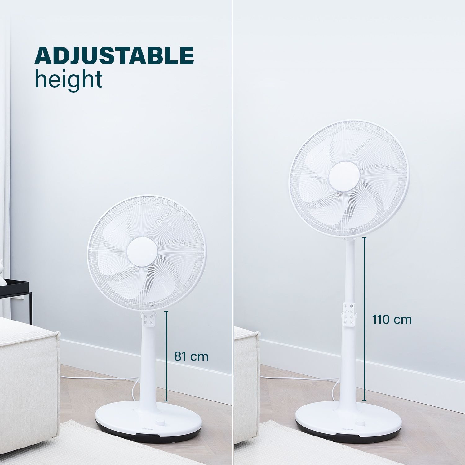Der Smart DC-Standventilator verfgt ber ein Bedienfeld fr den einfachen Zugriff auf alle Einstellungen sowie eine Fernbedienung fr zustzlichen Komfort. Dank seiner kompakten Gre von 40 cm und seines schlanken Designs ist er fr jeden Raum in Ihrem Zuhause geeignet. Darber hinaus arbeitet er leise (56 dB) und sorgt so fr eine ruhige und ungestrte Umgebung. Erleben Sie eine groflchige Khlung mit einem Schwenkbereich von 90.