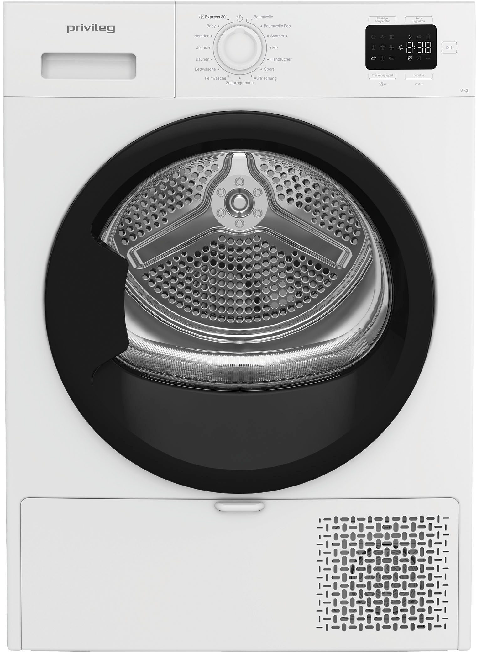Mit dem PD 8D WMB bietet Privileg einen leistungsstarken Wärmepumpentrockner. Die Kapazitätsanforderungen von Familien mit bis zu 4 Personen stellen mit einem 8 kg Fassungsvermögen kein Problem dar. Folgende Besonderheit zeichnet den PD 8D WMB Wärmepumpentrockner aus: Knitterschutz. Über die Startzeitvorwahl lässt sich programmieren, wann der PD 8D WMB Wärmepumpentrockner mit dem Trocknen anfängt. Das ist insbesondere dann hilfreich, wenn die Wäsche fertig sein soll, sobald man nach Hause kommt. Über die Restlaufanzeige des Wärmepumpentrockners hat der Nutzer immer im Blick, wie lange der aktuelle Trockengang noch braucht. Die Innenbeleuchtung des PD 8D WMB Wärmepumpentrockners ist von Vorteil, wenn man die Edelstahltrommel be- oder entlädt. Zum Schutz der kleinsten Familienmitglieder ist am PD 8D WMB Wärmepumpentrockner eine Kindersicherung vorhanden. Mit einer Размер von 59,8 cm x 84,6 cm x 54,5 cm (BxHxT) macht der Wärmepumpentrockner eine hervorragende Figur.