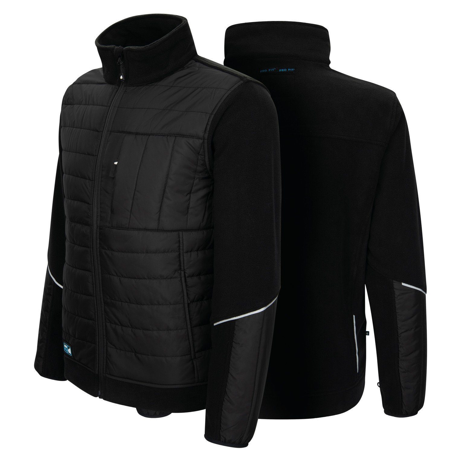 Die PRO FIT Funktionale Hybrid Fleecejacke kombiniert optimalen Tragekomfort mit modernen Funktionen und einem stylischen Design. Diese Unisex-Jacke in Schwarz ist ideal für kühle Tage, sowohl für die Arbeit als auch für die Freizeit. Hauptmerkmale: Wärmende Steppfront: Die Front der Jacke besteht aus gestepptem Material, das zusätzliche Wärme bietet und ideal für kühle Tage ist. Aktiver Feuchtigkeitstransport: Das hochwertige Fleece-Material ermöglicht einen aktiven Feuchtigkeitstransport, um Sie trocken und komfortabel zu halten. Fleece & Steppmaterial: Die Kombination aus Fleece und Steppmaterial macht diese Jacke warm, bequem, elastisch und beweglich. Vielseitige Taschen: Die Jacke verfügt über 2 seitliche Hüfttaschen und eine Brusttasche, alle mit Reißverschlüssen, um Ihre Wertsachen sicher zu verstauen. Modernes Design: Mit ihrem modernen und innovativen Design in Schwarz ist diese Fleecejacke nicht nur für die Arbeit, sondern auch für die Freizeit geeignet. Vorteile: Zusätzliche Wärme: Die gesteppte Front sorgt für zusätzliche Wärme, ideal für kühle Tage und wechselnde Wetterbedingungen. Hervorragender Tragekomfort: Dank des aktiven Feuchtigkeitstransports und der Kombination aus Fleece und Steppmaterial bleibt die Jacke angenehm trocken und komfortabel. Bewegungsfreiheit: Die elastischen Ärmelabschlüsse und das flexible Material bieten maximale Bewegungsfreiheit. Sichere Aufbewahrung: Die Reißverschlusstaschen bieten sicheren Stauraum für Ihre Wertsachen, sodass Sie alles Wichtige griffbereit haben. Vielseitige Einsatzmöglichkeiten: Diese stylische Jacke ist sowohl für den Arbeitsalltag als auch für Freizeitaktivitäten perfekt geeignet. Die PRO FIT Funktionale Hybrid Fleecejacke bietet Ihnen die perfekte Kombination aus Wärme, Komfort und Bewegungsfreiheit. Mit ihrem modernen Design und den praktischen Funktionen ist sie ideal für kühle Tage, egal ob bei der Arbeit oder in der Freizeit. Vertrauen Sie auf die Qualität und Vielseitigkeit der PRO FIT Hybrid Fleecejacke und fühlen Sie sich in jeder Situation wohl und gut geschützt.