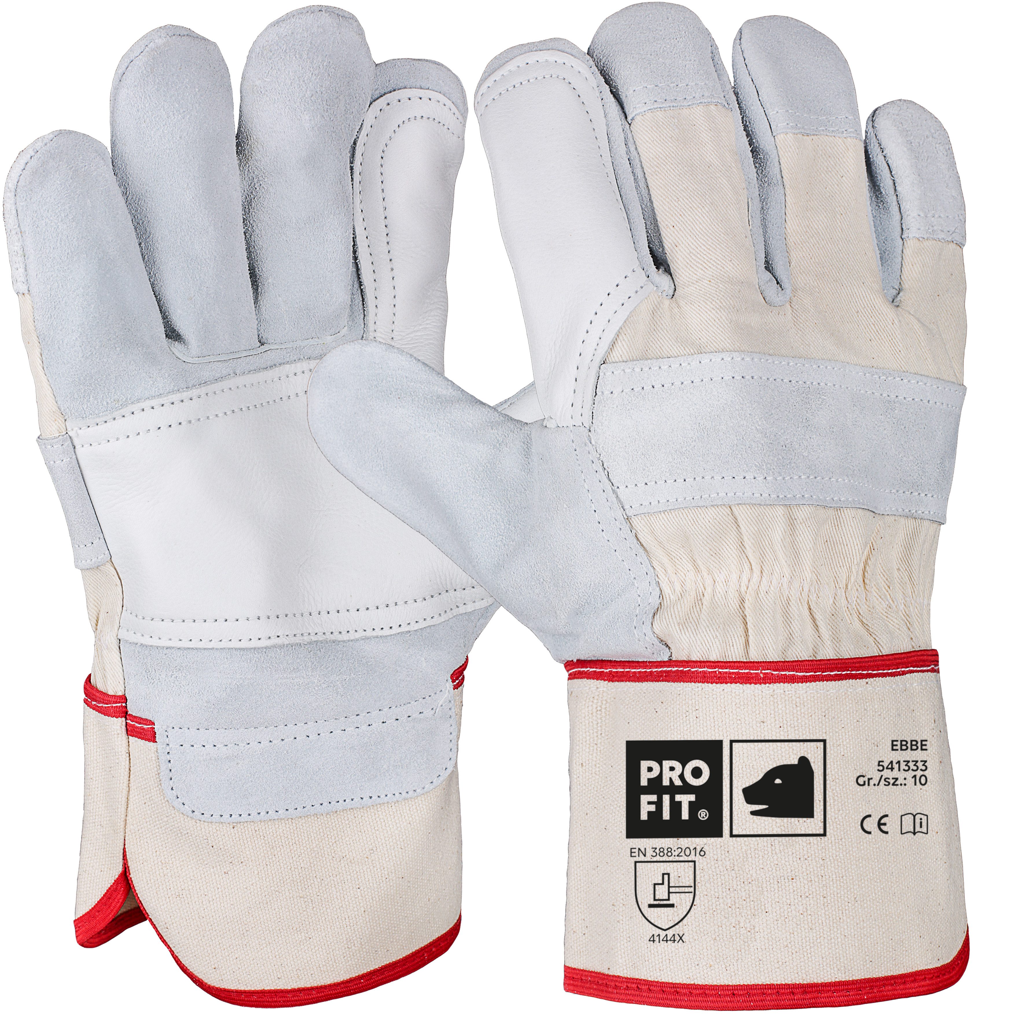 Der Rindspalt Leder Arbeitshandschuh "Ebbe" ist ein robuster Handschuh, der für extreme Einsatzbereiche und längere Standzeiten entwickelt wurde. Aus widerstandsfähigem Rindspaltleder gefertigt, bietet er zusätzlichen Schutz durch die Verstärkungen an Daumen, Zeigefinger und der Handinnenfläche. Mit seiner gummierten Canvas-Stulpe und einem Innenhandfutter ist dieser Handschuh ideal für harte und mechanisch anspruchsvolle Arbeiten. Er eignet sich besonders gut für das Handwerk, die Schwerindustrie sowie die Logistik und das Gebäudemanagement. Hauptmerkmale: Der Handschuh besteht aus hochwertigem Rindspaltleder mit zusätzlichen Verstärkungen aus Rindspaltleder an besonders beanspruchten Stellen, wie dem Daumen, dem Zeigefinger und der Handinnenfläche. Die Stulpe aus gummiertem Canvas bietet zusätzlichen Schutz und Komfort bei Arbeiten in extremen Umgebungen. Dank der hohen Abriebfestigkeit (EN 388:2016, Abriebfestigkeit: 4), ist der Handschuh besonders langlebig und widerstandsfähig gegen mechanische Belastungen. Die Innenhand ist zusätzlich gefüttert, was für einen hohen Tragekomfort sorgt, selbst bei längeren Einsätzen. Die Schutzklasse PSA-Kat. II garantiert Schutz vor mittleren Risiken, während die Впередreißfestigkeit (Stufe 4) und die Durchstichfestigkeit (Stufe 3) zusätzlichen Schutz vor mechanischen Verletzungen bieten. Der Handschuh entspricht den Normen EN 420:2003+A1:2009 und EN 388:2016. Vorteile: Die Volllederverstärkung an den stark beanspruchten Stellen wie der Handinnenfläche, dem Daumen und dem Zeigefinger sorgt für eine längere Standzeit und zusätzliche Sicherheit bei intensiven Arbeiten. Die gummierte Canvas-Stulpe schützt die Handgelenke und ermöglicht einen sicheren Sitz des Handschuhs. Das Innenfutter bietet hohen Tragekomfort, selbst bei langen Arbeitszeiten oder in extremen Einsatzbereichen. Durch die hohe Abrieb- und Впередreißfestigkeit eignet sich der Handschuh ideal für Arbeiten in der Schwerindustrie, im verarbeitenden Gewerbe und in der Logistik. Er bietet zudem einen mechanischen Rundumschutz gegen Verletzungen, wie er im Handwerk und der Industrie benötigt wird. Die Zertifizierung nach EN 388 gewährleistet zudem einen verlässlichen Schutz vor mechanischen Gefahren. Der Rindspalt Leder Arbeitshandschuh "Ebbe" ist ein strapazierfähiger und komfortabler Arbeitshandschuh, der optimalen Schutz und Langlebigkeit für den Einsatz in anspruchsvollen Arbeitsumgebungen bietet.