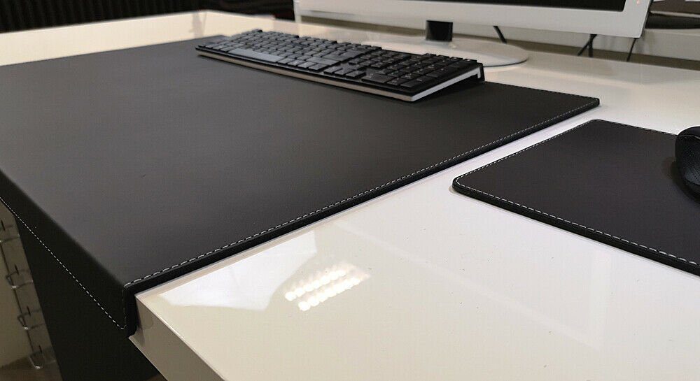 Profi Mats Schreibtischunterlage gewinkelt + Mauspad Echt Leder Schwarz silber Naht 90x47
