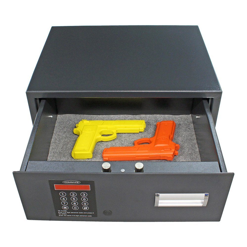 Im Caser 2 Kurzwaffentresor von Profirst mit Elektronikschloss können Sie Ihre Kurzwaffen sicher verwahren. Der einwandige Schubladentresor aus Stahl ist nur in Österreich zur Lagerung von Kurzwaffen erlaubt, in Deutschland für Wertgegenstände bzw. Munition verwendbar. Versperrt wird der Caser 2 mit einem Elektronikschloss, eine elektronische Notöffnung mittels Mastercode oder mechanische Notöffnung (inklusive 2 Schlüssel) möglich. Durch das beigelegte Befestigungsmaterial lässt sich der Kurzwaffentresor einfach und schnell befestigen. Beachten Sie, vor dem Bohren die Schublade zu entfernen, die mit zwei Plastik-Sicherheitssperren auf zwei Metallschienen gesichert ist. Durch Drücken lässt sich der Sicherheitsmechanismus entriegeln und Sie können die Schublade entfernen.